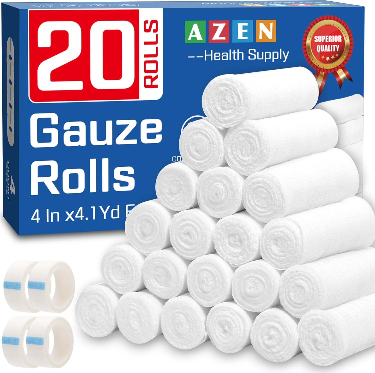 AZEN 20 Pack Gauze Rolls Bandages, 4 in x 4.1 Yards, Premium Medical Supplies & First Aid Supplies, Bandage Wrap Vet Wrap, Mummy Wraps