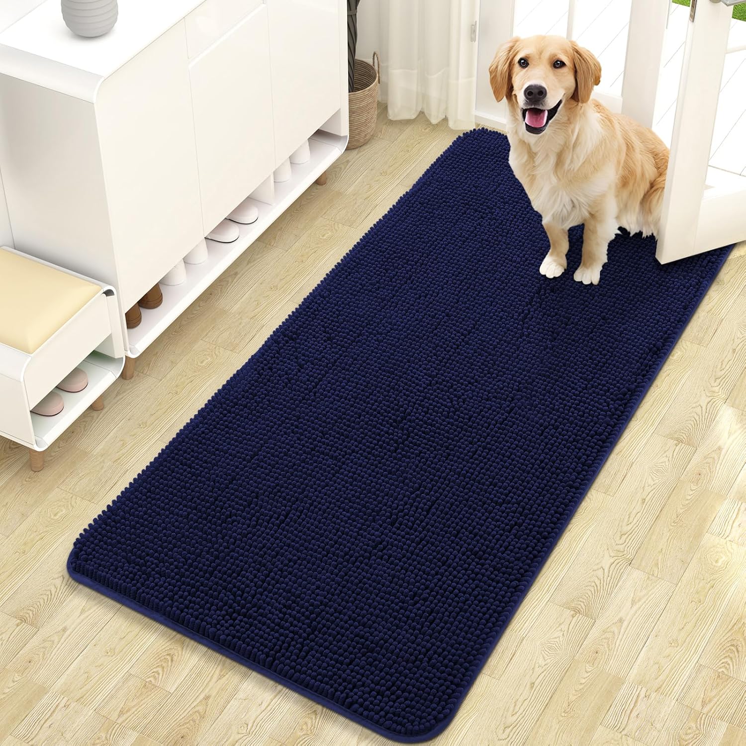 OLANLY Dog Door Mat for Muddy Paws 47x24, Absorbs Moisture and Dirt, Absorbent Non-Slip Washable Doormat, Quick Dry Chenille Mud Mat for Dogs, Entry Indoor Entryway Carpet for Inside Floor, Navy Blue