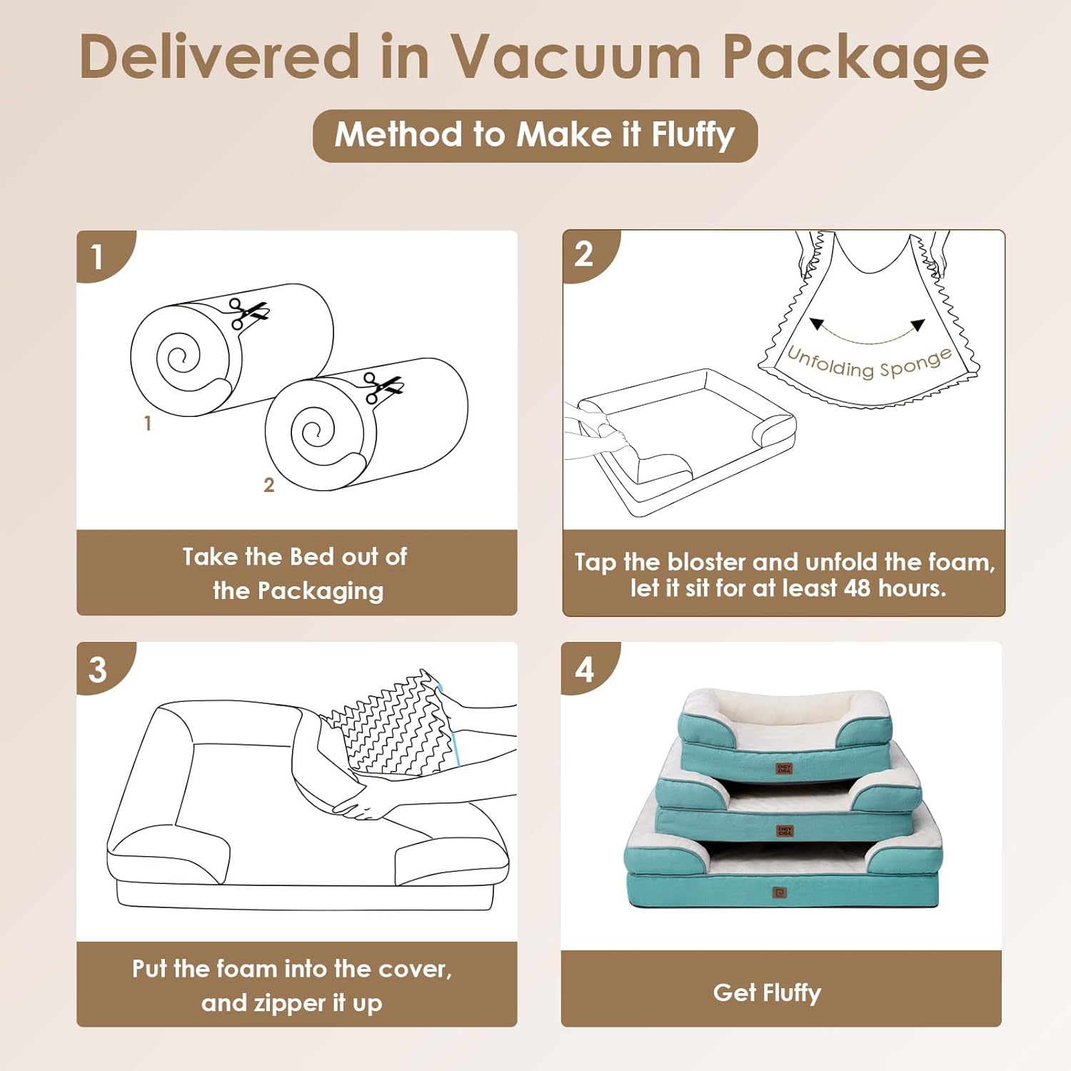 - CARE INSTRUCTIONS: Our dog bed features a removable and washable cover with a zipper closure, making it easy to clean. Remove the foam insert, and the cover can be washed in a machine. Please note that the foam insert is not washable. Allow the bed to expand for 24-48 hours after unpacking.