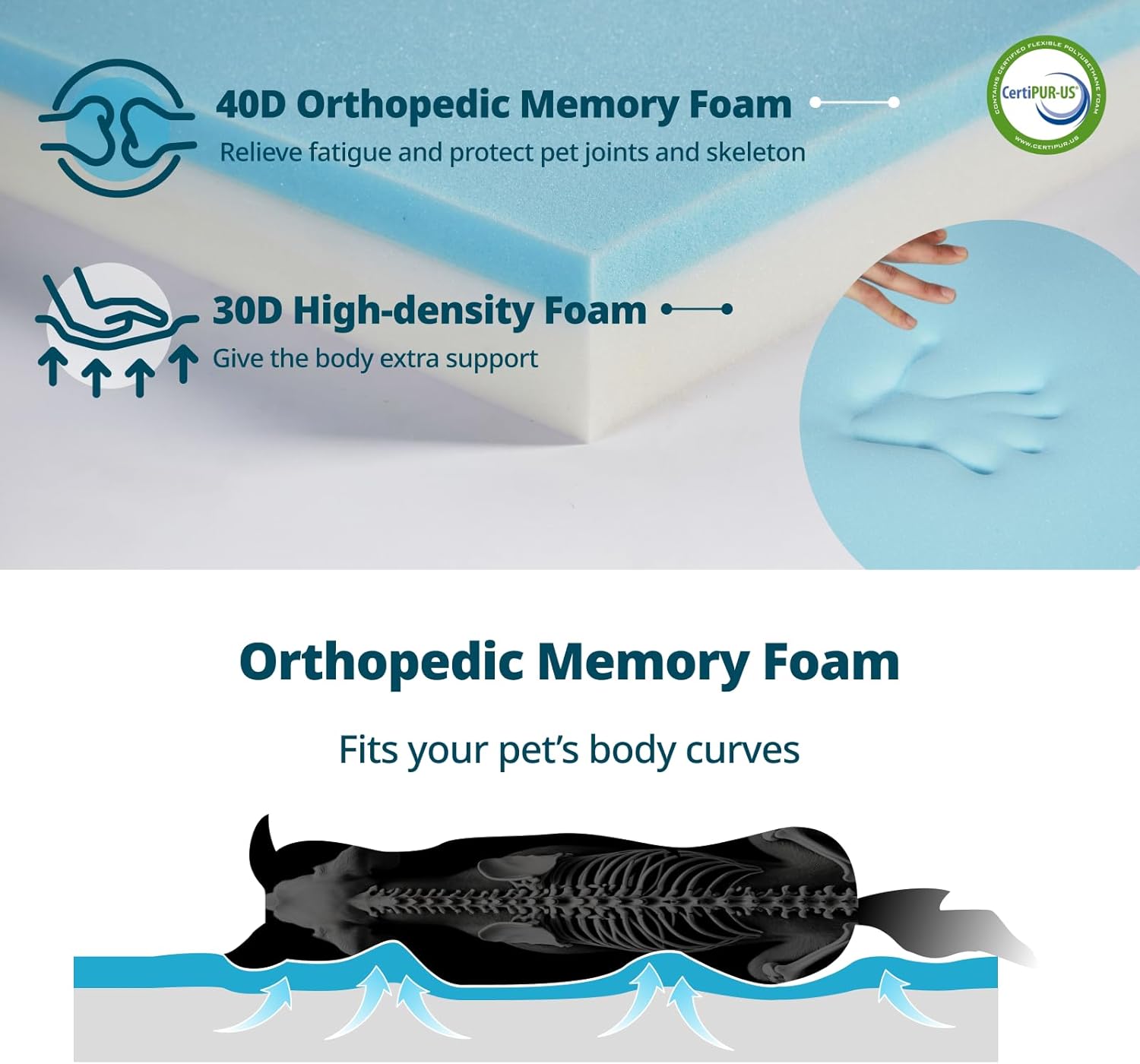 - Orthopedic Memory Foam: Our large dog bed uses a combination of 40D memory foam and 30D high-density foam. Evenly distributes weight and conforms to your pet's body, reducing pet stress and protecting joints.