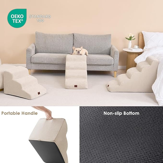 - SPECIFIC AND STEADY DESIGN - 33D density of pure foam make this stair more steady when your pets walk on. The dog bed stairs can provide strong support for pets in the walking process. Low angle slope design can better protect your pet's joints.