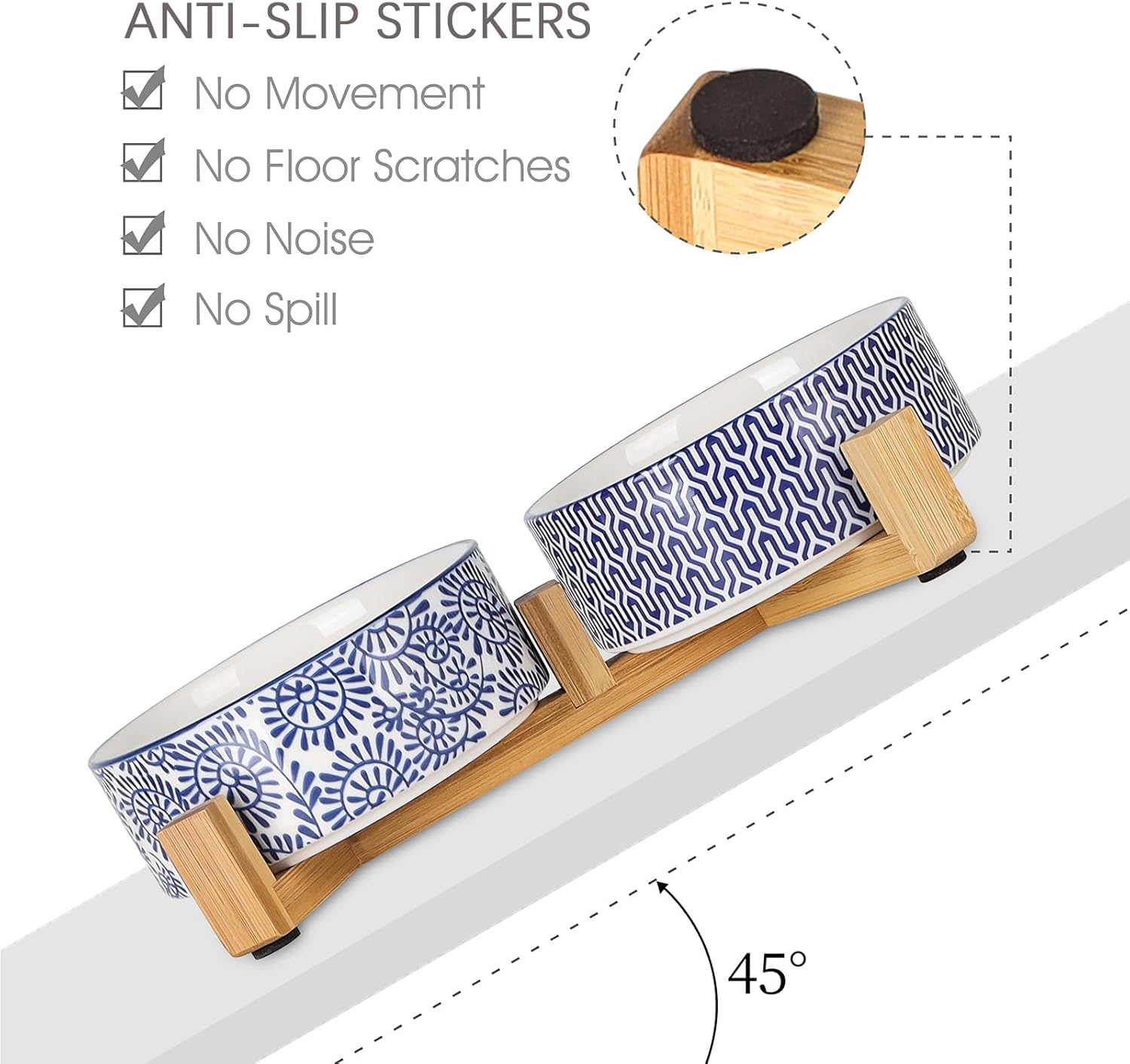 - DOUBLE BOWLS, DELICATE DESIGN - The thoughtful design of these double bowls offers convenience for your pets. You can use one bowl for food and another one for water, raising the dishes closer to your pet for more comfortable eating. Decorated with blue flowers and geometric patterns, these make them more unique that fit perfectly with any home decor style.