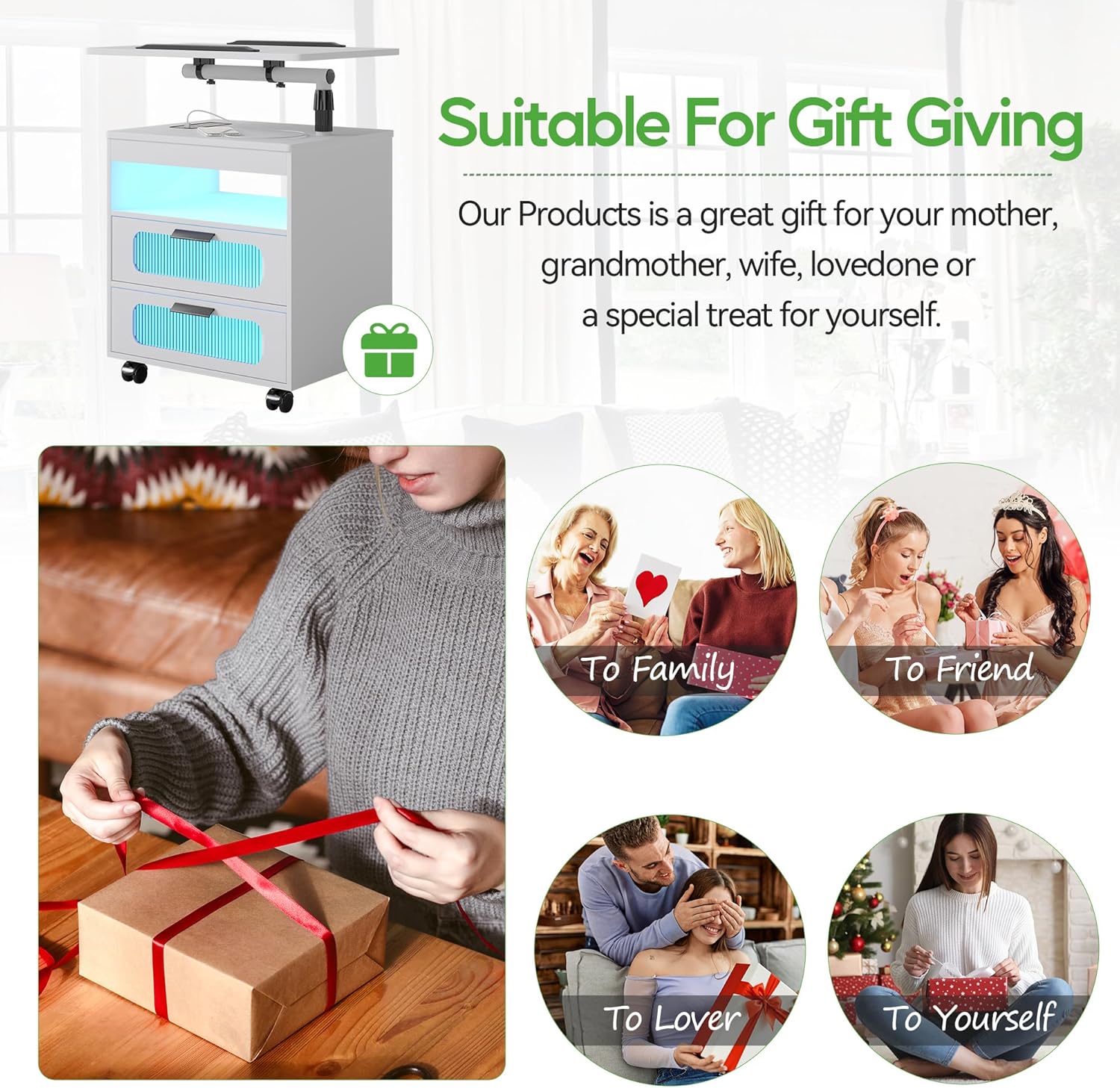 HNEBC Nightstand with Wireless Charging Station, LED Nightstand Has Adjustable Rotary Workstation,Smart Night Stand with 2 Drawers,Modern Bedside Table for Bedroom, Sensor Light/Wheel (White)