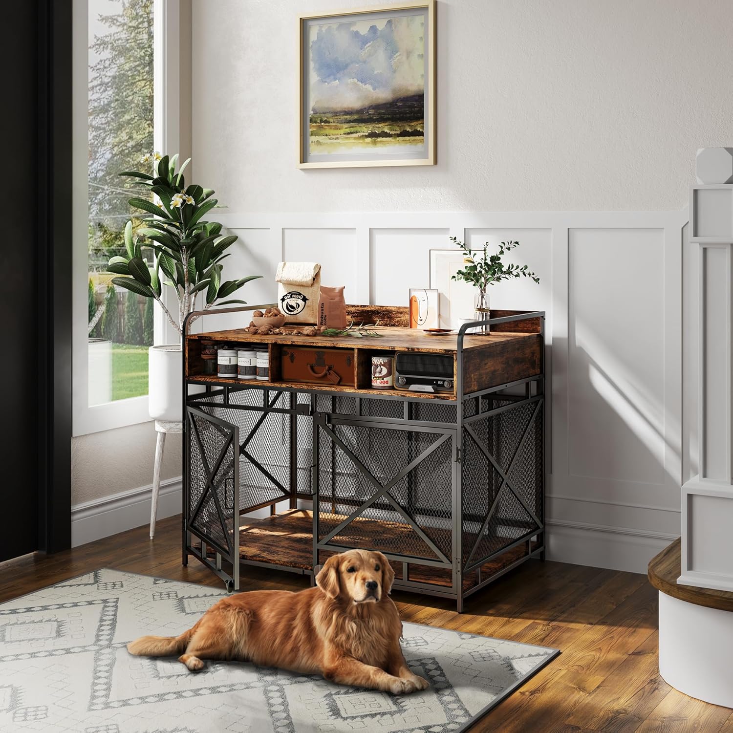 Dog Crate Furniture, 43" Heavy Duty Wooden Dog Crate End Table, XL Dog Kennel Furniture Large Breed, Decorative Dog Kenne Indoor with 3 Drawers & Steel Tubes 43" L x28 W x36 H (Rustic Brown)