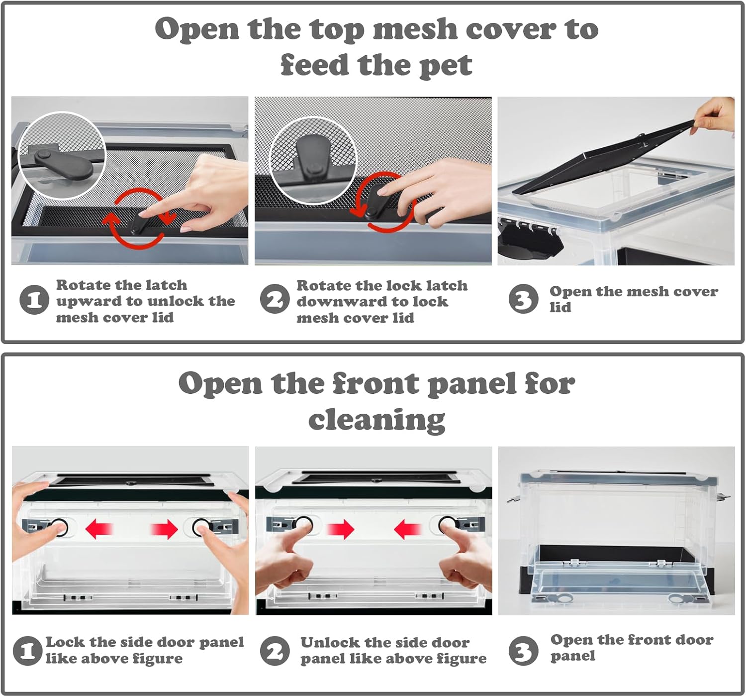 - Clever Design:Portable small snake terrarium is designed with multiple small air holes for ventilation there is a breathable panel mesh cover on the top,can be opened,closed,and disassembled,ventilation and breathability,ensuring air circulation in the internal habitat,multiple vents at the bottom and sides allowing pets to breathe fresh air. front panel can be opened or closed,convenient cleaning of pet houses,four rolling pulleys at the bottom,carrying out, and not easily broken