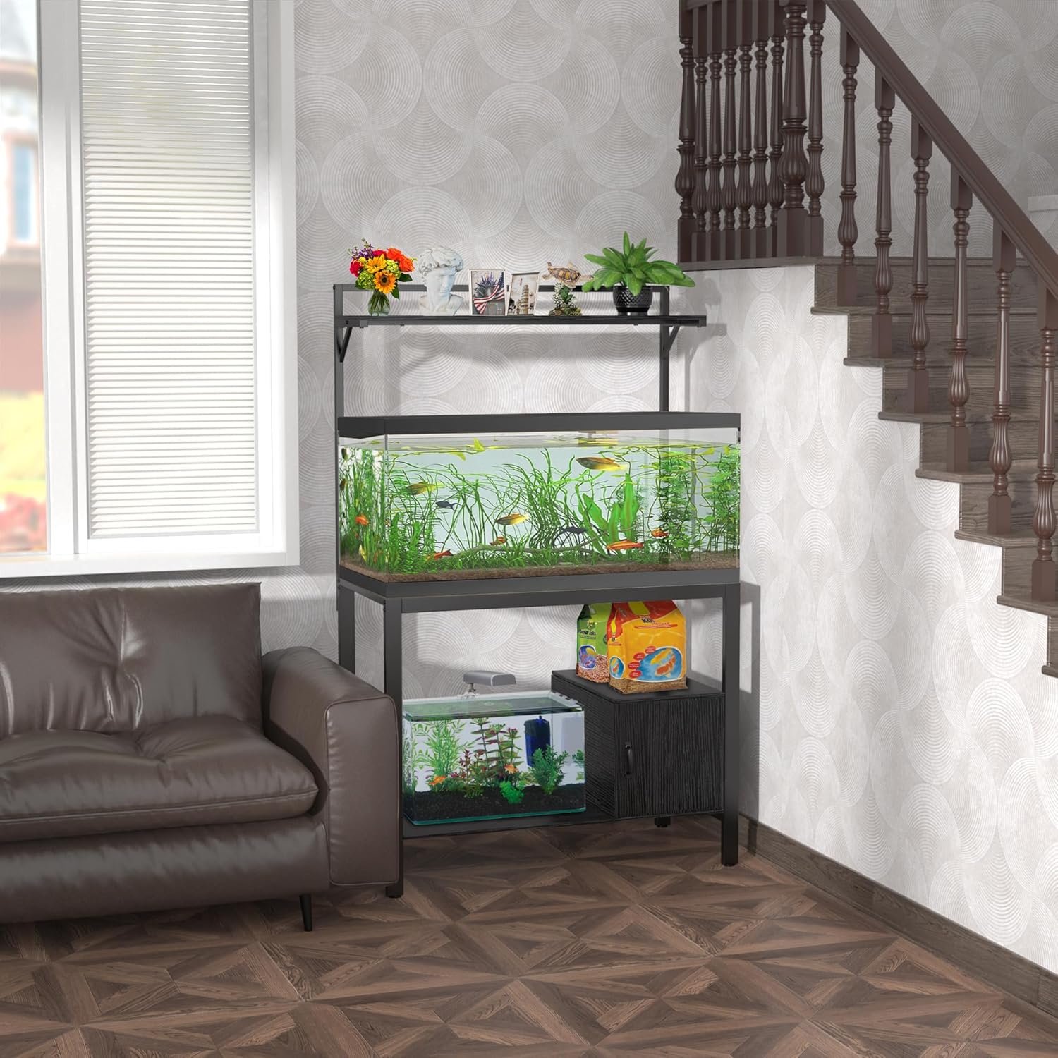 - Versatile: Besides two aquariums, our fish tank stand allows you to store your fish accessories: fish food, fish net,gravel cleaner, water conditioner,etc. All in a no clutter configuration, neat & well-organized.