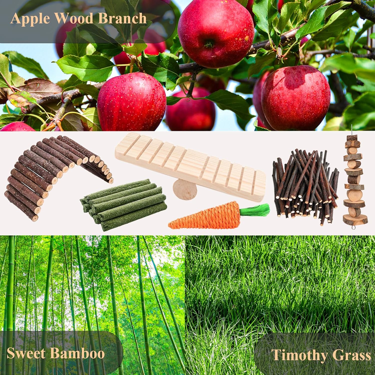 - 【Package Include】Our Guinea pig toys set includes 1x apples wood ladder bridge(Size: 7.8*3.9inch), 1x apples wood molar string(Length: 8.6inch), 5x apple wood sticks and 1x grass woven carrot(Length: 5.4inch),3x timothy hay sticks,1x seesaw(Size: 7.4*2.7inch),1x pentagram(Length: 2.6inch). Handmade products may have dimensional errors.