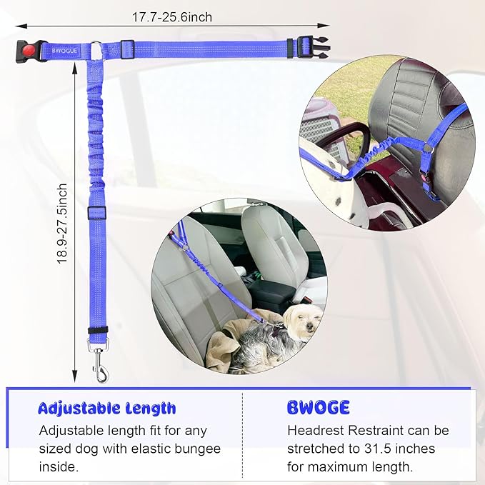 - ADJUSTABLE LENGTH: Dogs come in different sizes and weights. With buckle on the straps and the elastic bungee inside, The BWOGE Headrest Restraint is adjustable between 18.9-27.5 inches and can be stretched to 31.5 inches for the maximum length. The circle can be adjusted from 17.7 inches to 25.6 inches.You can easy to adjust the dog leash to the suitable length to keep your pet in a safety state.