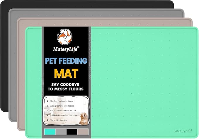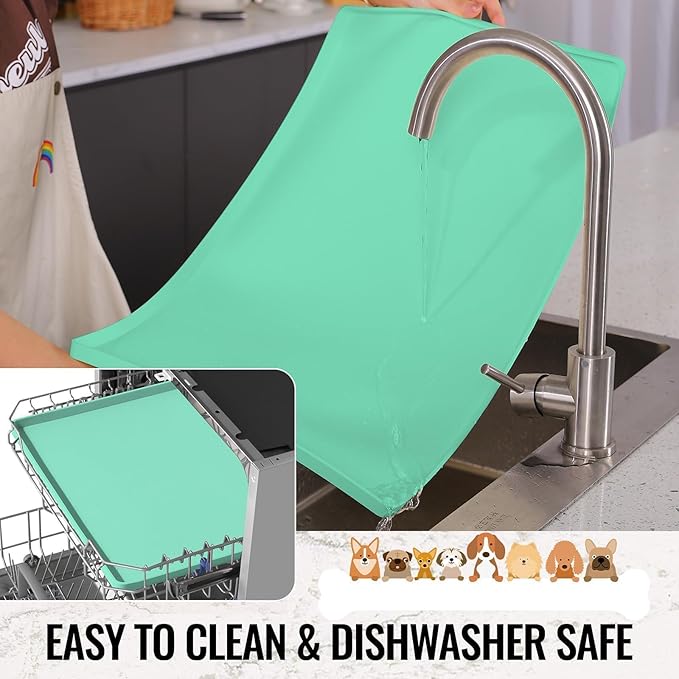 MateeyLife Dog & Cat Food Mat - Waterproof, Nonslip, Raised Edges, Silicone Tray for Messy Drinkers, 24"x16", Mint Green