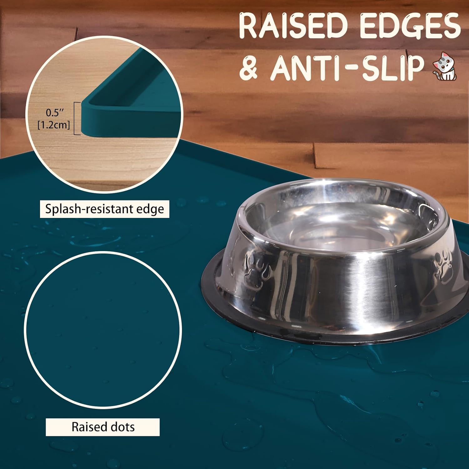 - Raised Edge Design: The food mat for cat bowls, dog bowl mats for food and water and boot tray measure 18" x 12" with a 0.5-inch raised edge that helps to keep all the mess contained on the small rubber mat for dog bowls. As a barrier, the waterproof dog mat for food and water, pet feeding mats for dog bowls and cat mats for food and water are perfect for pets who eat with enthusiasm or like to play with their food, effectively preventing pets from eating food that has been soiled by the floor