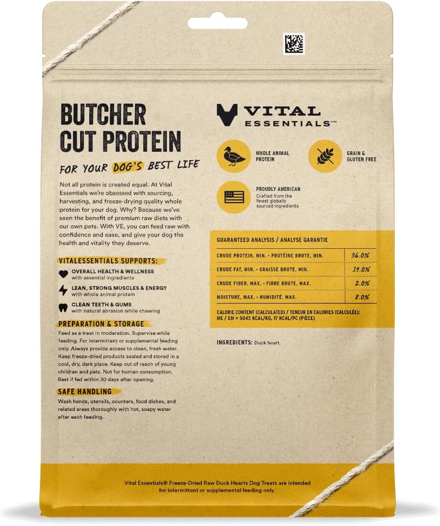 - FREEZE-DRIED RAW DUCK HEART DOG TREATS: Vital Essentials Freeze Dried Raw Dog Treats are a high-protein, low calorie treat that can help support your dog's overall health. These treats contain no artificial preservatives or additives. Duck Heart is the only ingredient.