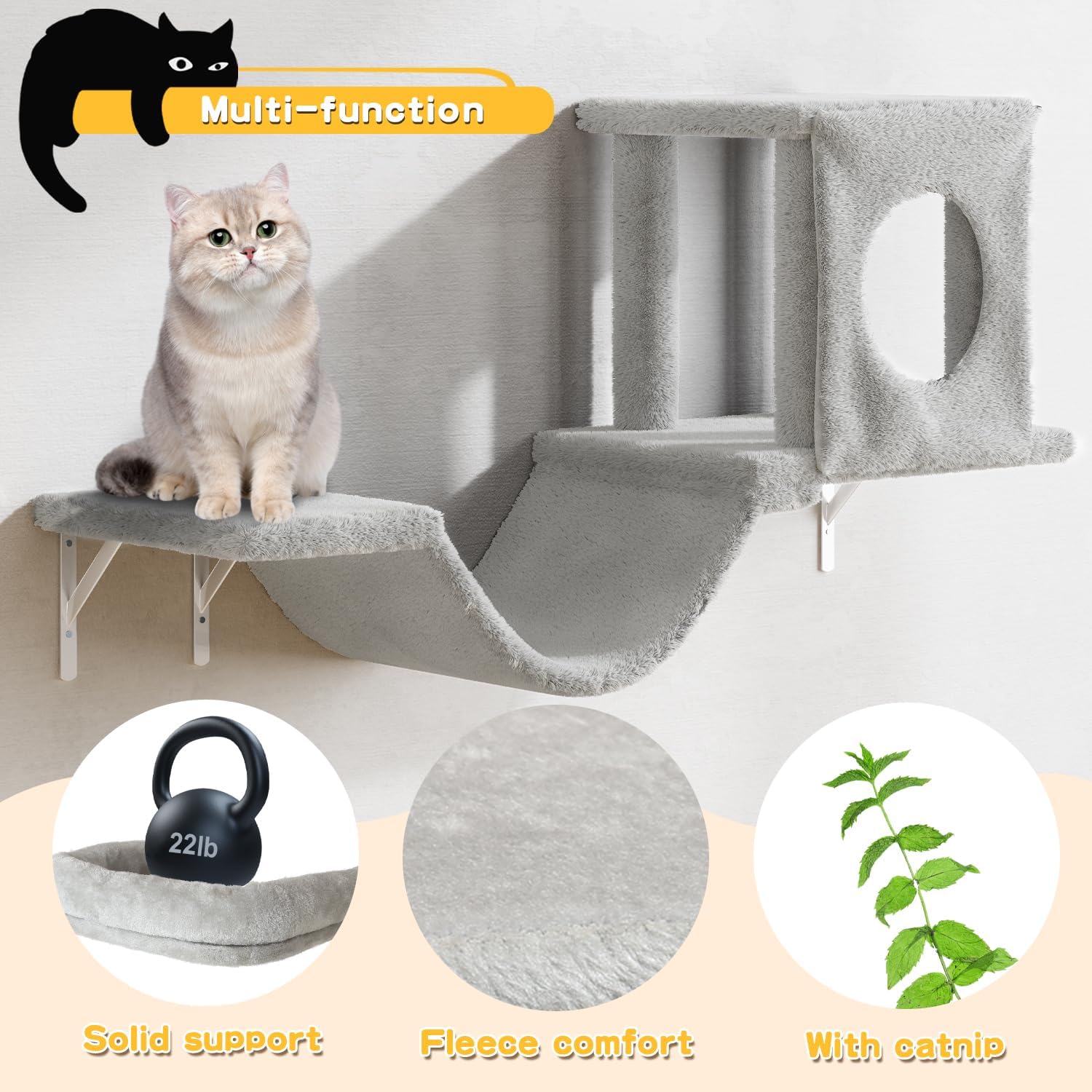 NUNU LAB Wall Mounted Cat Climber Set, 6 Pcs Cat Furniture Set with House, Bridge, Steps, Scratcher Board and Hammock, Shelves for Indoor, Luxury Walls Furniture(Gray)