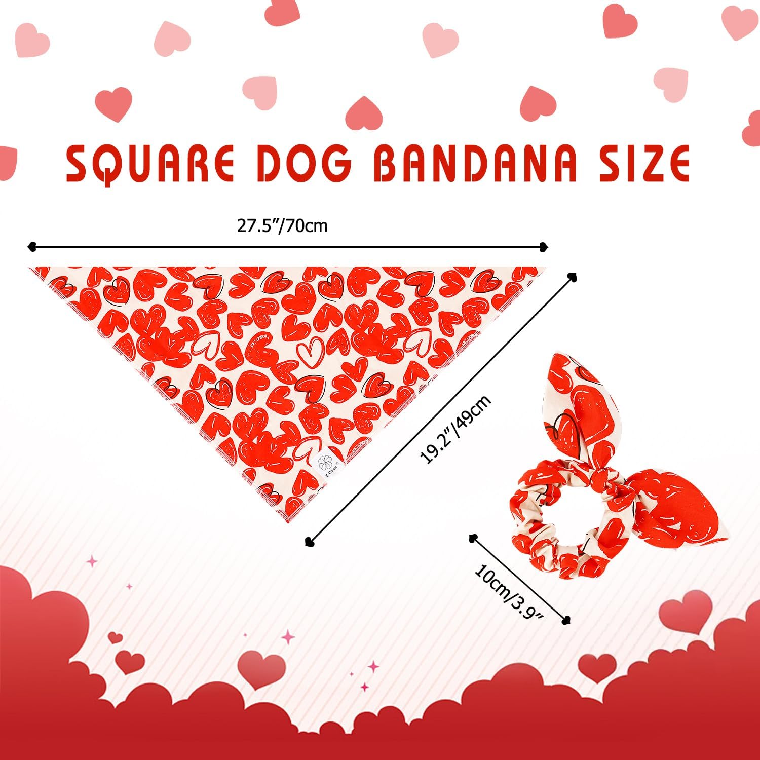 - Valentines Day Dog Bandana Size:19.2''*19.2'' (49cm *49cm). The adjustable holiday dog bandanas fit pet neck size up to 21.2'' (54cm). You can roll the square dog mothers day bandana a couple of times to fit your dog & cat. Please measure your pet's neck before buying. Matched hair scrunchie is one size fits all.