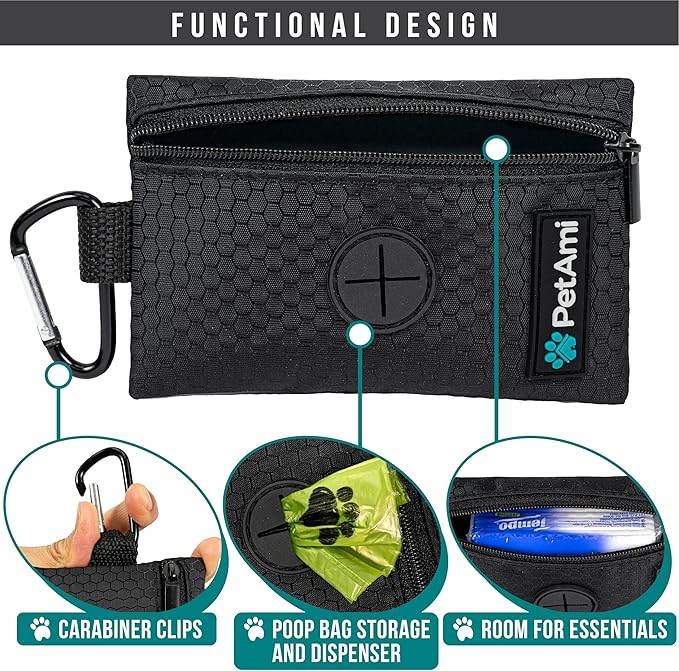 - BLACK DOG WALKING BAG: PetAmi poop bag holder dispenser includes one roll of dog poop bags, measures 5 x .25 x 3.25 inches, and is made of durable oxford polyester. Doggy trash bag carrier is refillable and is compatible with most dog poop bag rolls. This pet travel bag is a great gift for dog mom, dad, parents, owners, and trainers. Comes in multiple colors to mix and match your dog leashes.