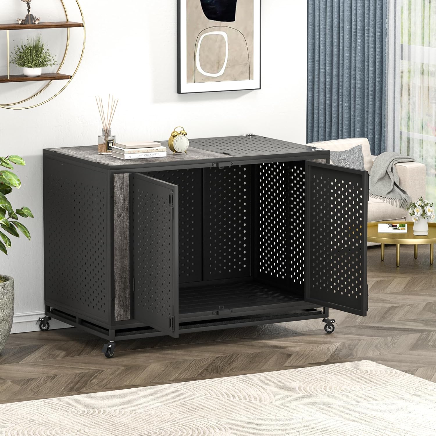48" Heavy Duty Dog Crate Furniture for Extra Large Dogs, Enclosed Design with 0.5 inch Holes, Indestructible Metal Kennel for High Anxiety Dogs, Chew Proof Pet House Cage Indoor, Gray