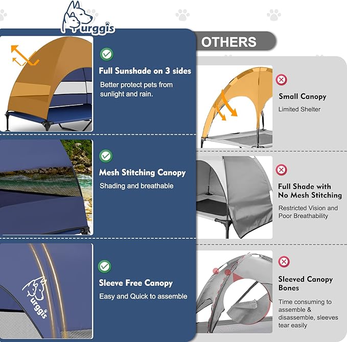 - Wide Application: With the unique adjustable feet, this bed is great for outdoor use beach, picnic, camping, yard, patio, it keeps pets cool, dry and off bugs for a great outdoor time. We can also remove the canopy to provide dogs a comfortable place to spend their indoor time. This dog cot bed is under Furggis 100% satisfactory guarantee. If you have any questions with it, please tell us, we will get back to you within 24 hours and work it out for you as soon as possible.
