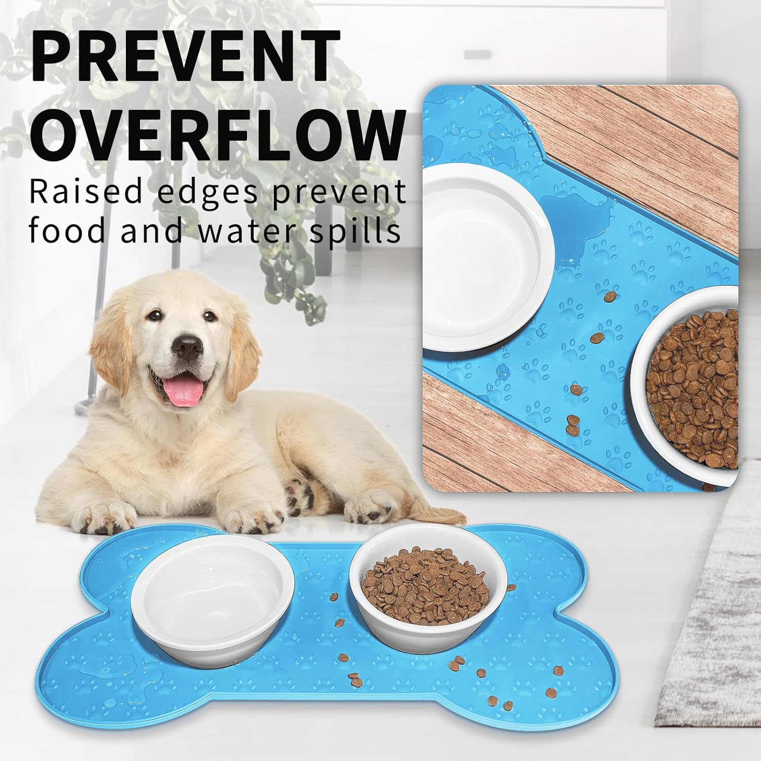 - Raised Edge - The high edge of this feeder mat keeps food and water within the tray and prevents spillage onto a clean floor. Keep your living space tidy and clean, say goodbye to messy floors, you just need to clean the dog bowl mat regularly.