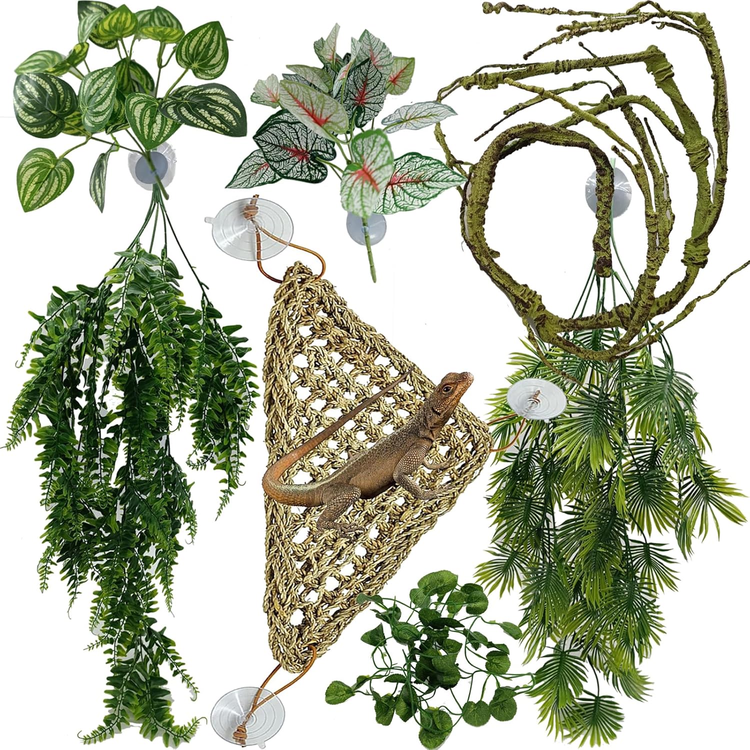 - 【Include】1 x Large Triangle Hammock, 2 x Large Plastic Hanging Leaves vines, 1 x Flexible Bendable Reptile vine branch of 47 inch / 120cm in length, 1 x vine leaves decor, 2 x mini Hanging Ivy Plants of 12 inch / 31cm in length, 6 x large/strong suction cups of 2 inch / 5cm in Dia. Perfect for reptile habitat decorations, terrarium hanging, snake terrarium decorations.