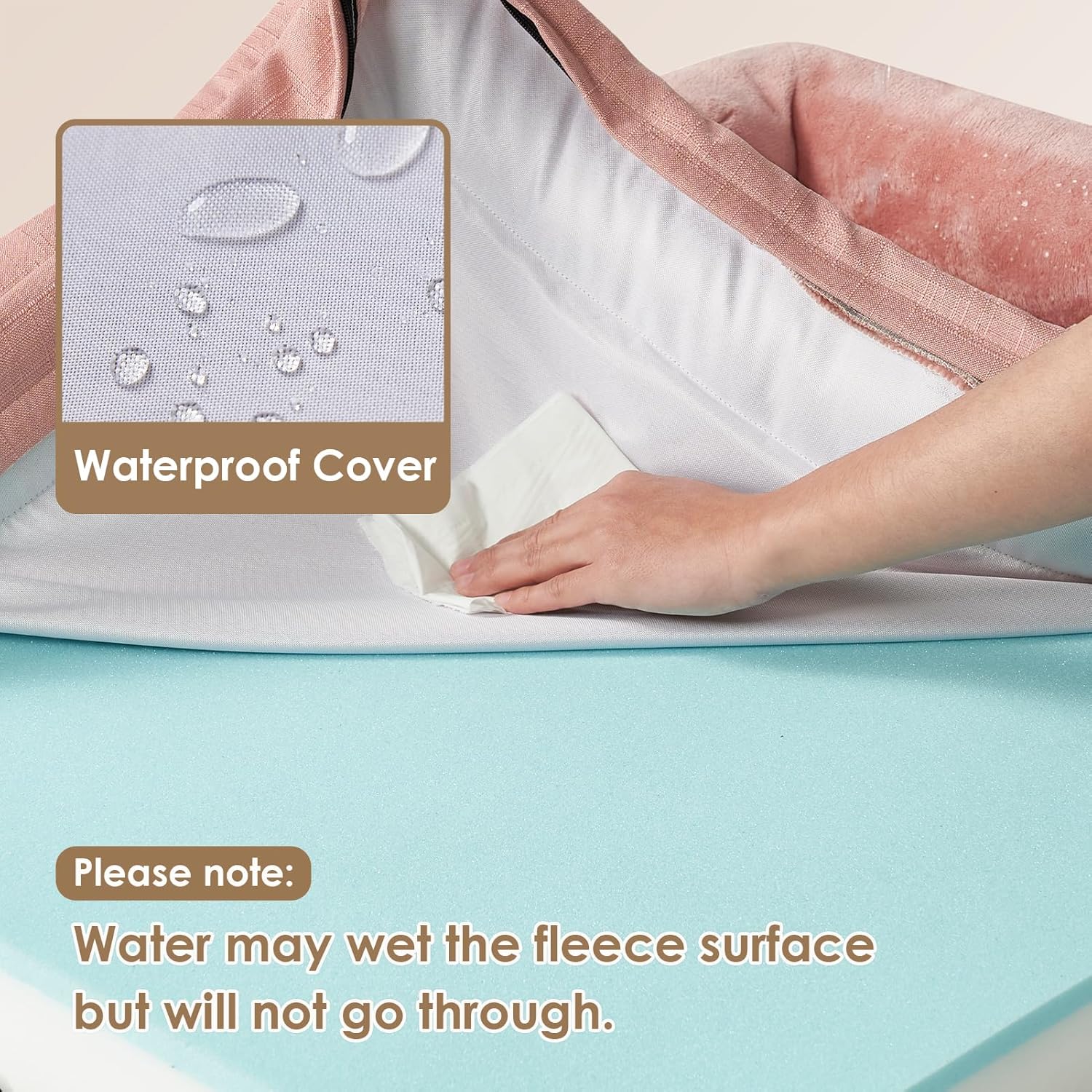 - WATERPROOF COVER: A waterproof film is positioned between the fleece surface and the bottom fabric, ensuring the dog bed remains dry. However, the faux linen sides are not waterproof.