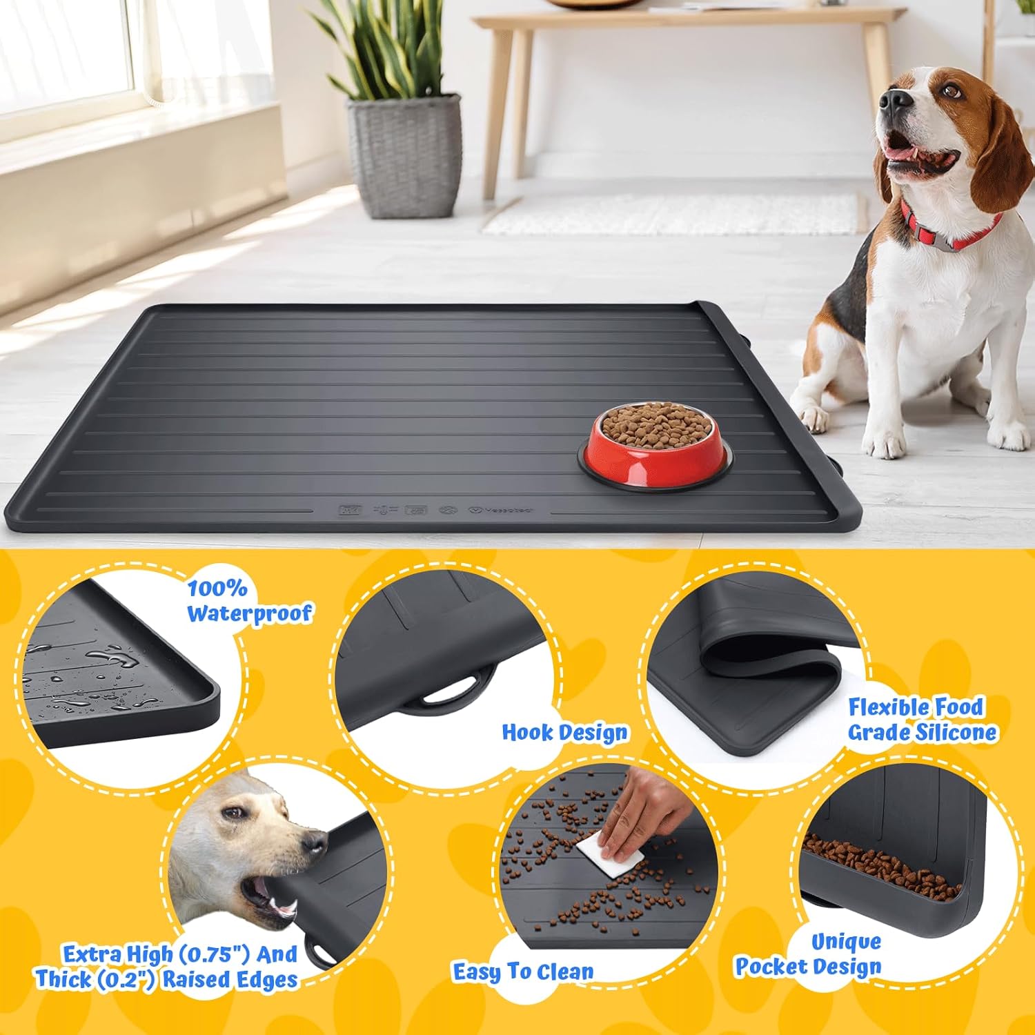 Dog Feeding Mat - 39''x27'' Large Silicone Pet Food Mats with Residue Collection Pocket and High Edges, Floors Waterproof Dog Cat Bowl Mat Prevent Water Food Spills, Black
