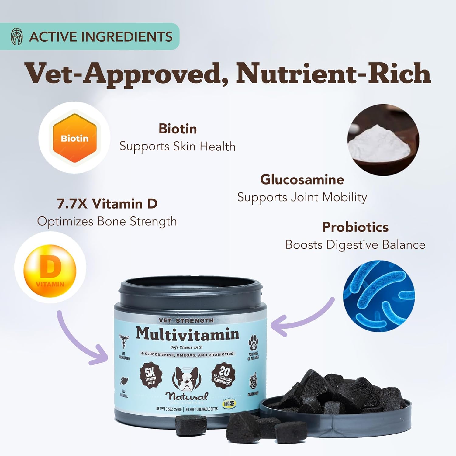 - CERTIFIED FOR TRUSTED QUALITY & SAFETY: Formulated with natural ingredients, this NASC-certified dog wellness formula is rigorously tested for purity, potency, and safety. Crafted with high-potency dog health supplements, giving you peace of mind with every chew. Vet-recommended and trusted for skin and coat supplements, hip and joint chews, and digestive health support.