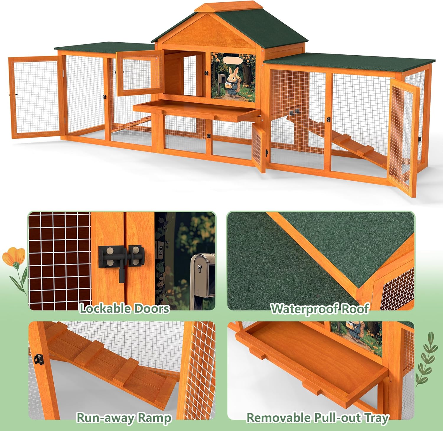 - Spacious & Safe: Our 82-inch-long oversized double-decker wooden rabbit cage outdoor has three spaces to move around on the first floor, with skateboards on both sides to ensure the safety of your pet, and the second floor can rest to avoid outside disturbances and provide a comfortable environment for your pet baby