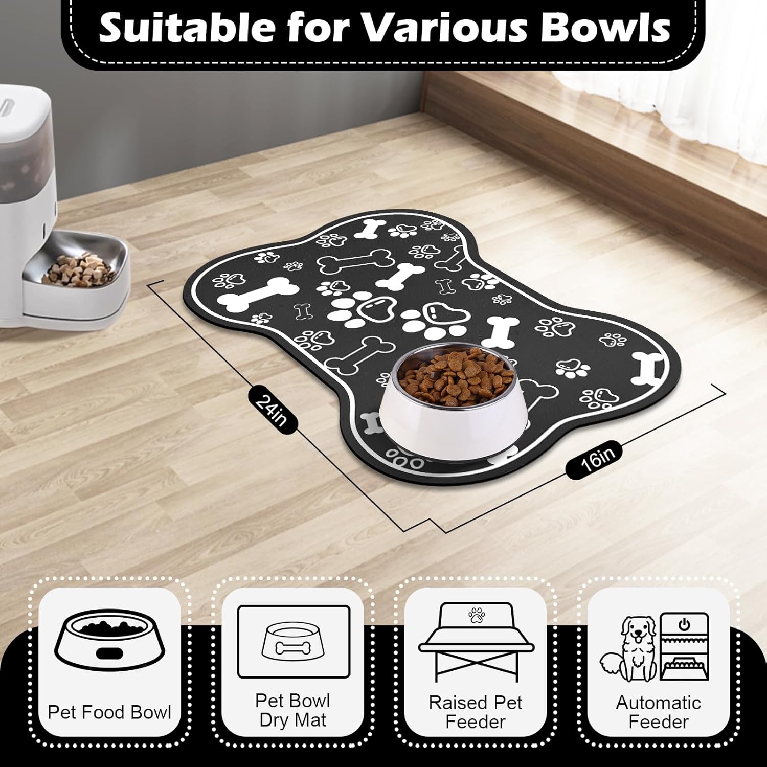 Dog Cat Food Mat,Rapid Absorbent Pet Feeding Mat, Bone Shaped Dog Placemat Water Bowl Mat with Rubber Backing,No Stains Dog Cat Food Mats Indoor, Pet Accessories Supplies 16"×24" Black
