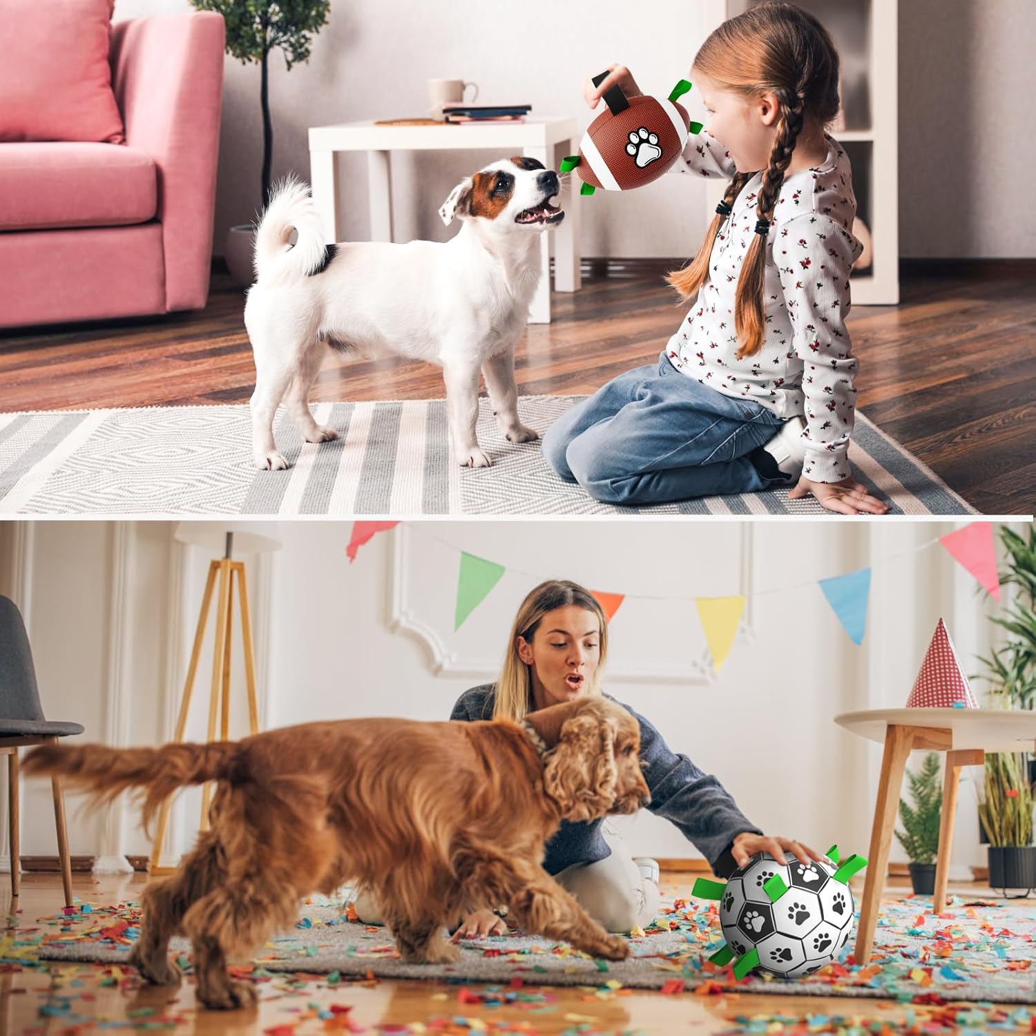 - What you Get: 1*dog soccer ball, 1*dog football, 1*pump adapter, 1*instruction. Both soccer ball and football are made of premium PU, complying with the exact same standard as children's toys, can be kicked and bounces well, suitable for all breed sizes dogs