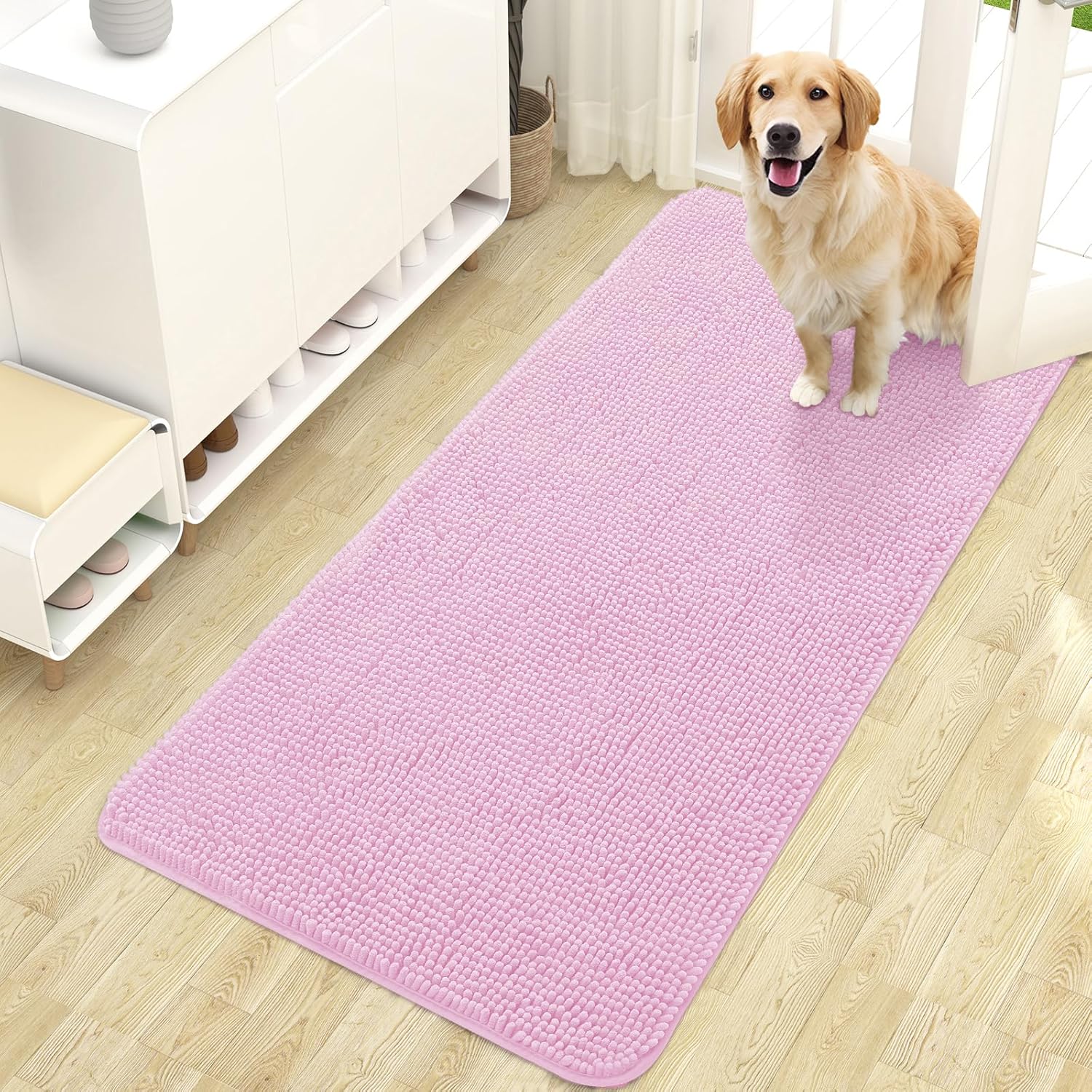 OLANLY Dog Door Mat for Muddy Paws 47x24, Absorbs Moisture and Dirt, Absorbent Non-Slip Washable Doormat, Quick Dry Chenille Mud Mat for Dogs, Entry Indoor Entryway Carpet for Inside Floor, Pink