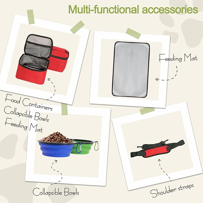- 【The Dog Travel Organizer Kit Bag Ideal for everyday use for all of your essentials】: conveniently carries food, water, treats, leashes, Frisbee, pet toys, first-aid kit. Applicable Occasions: traveling, hiking, outdoor activities, go to the park.