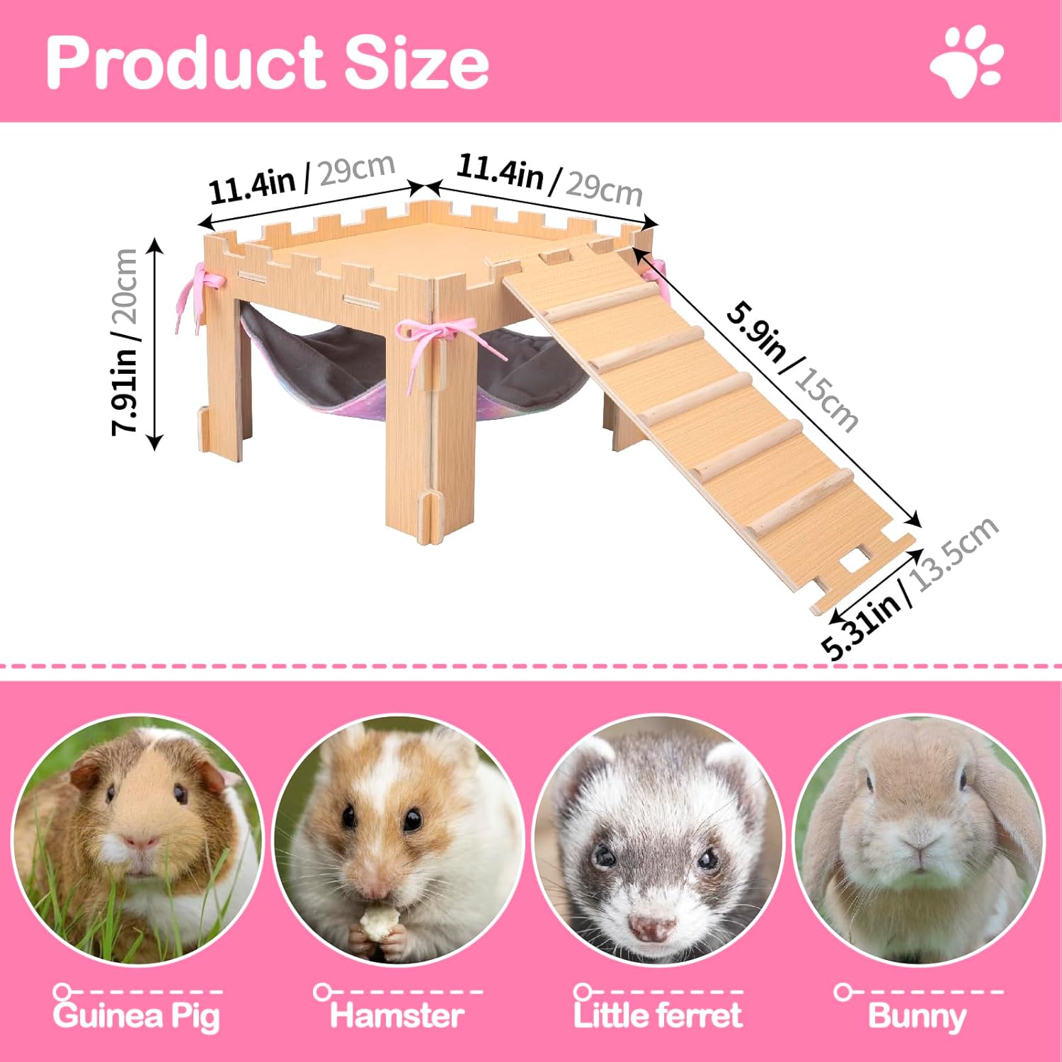 Guinea Pig Hammock with Platform and Ramps,Wooden Small Animal Hideout with Waterproof Coating Mat Hammock,Guinea Pig Cages Accessories Toys Hiding Playing,Easy to Clean(Double)