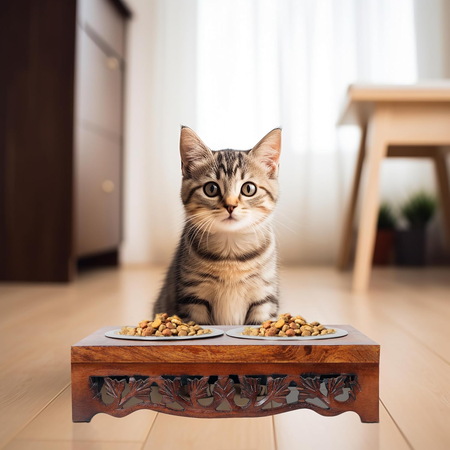 - 🐕 Perfect for Small and Medium-sized Pets: Upgrade your pet's feeding experience with the Scroll Handcarved Pet Feeding Station by IRONGATE - Sleek, Eclectic, adventurous, and ready for food. This dog food stand allows your pet to eat in a healthy position to reduce stress on the neck and spine. This promotes better digestion and thus better health. Keeps your pet happy and comfortable.