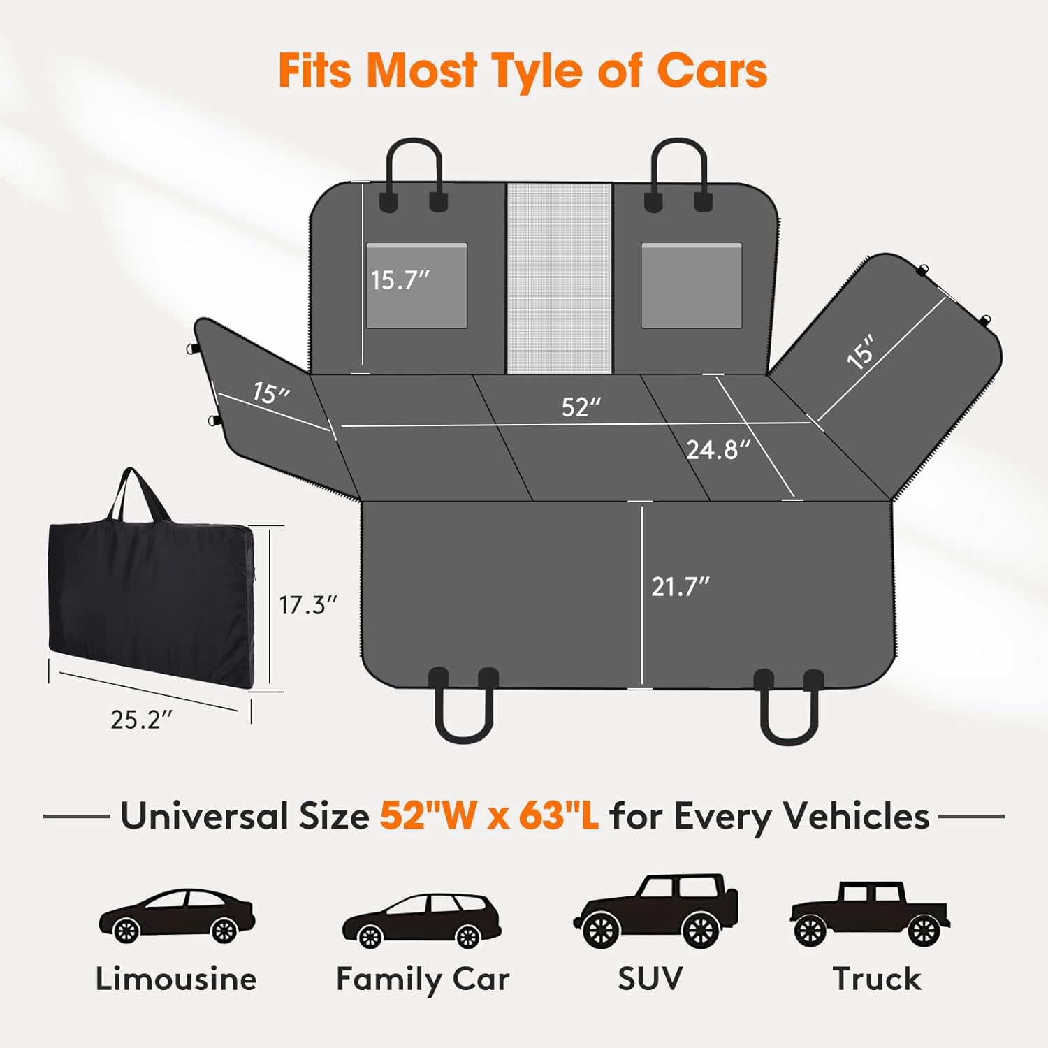 - 【6-Layer Durability & Protection】No more slouchy dog seat covers! Unlike the traditional seat cover being soft and easy to collapse, it can hold up a weight capacity of 280 lbs, making it suitable for various dog sizes! The 52"W x 63"L backseat seat covers for cars uses the new upgraded fabric of 6-layer fabrics, this dog back seat cover is waterproof to protect your seat from mud, liquid, and hair.
