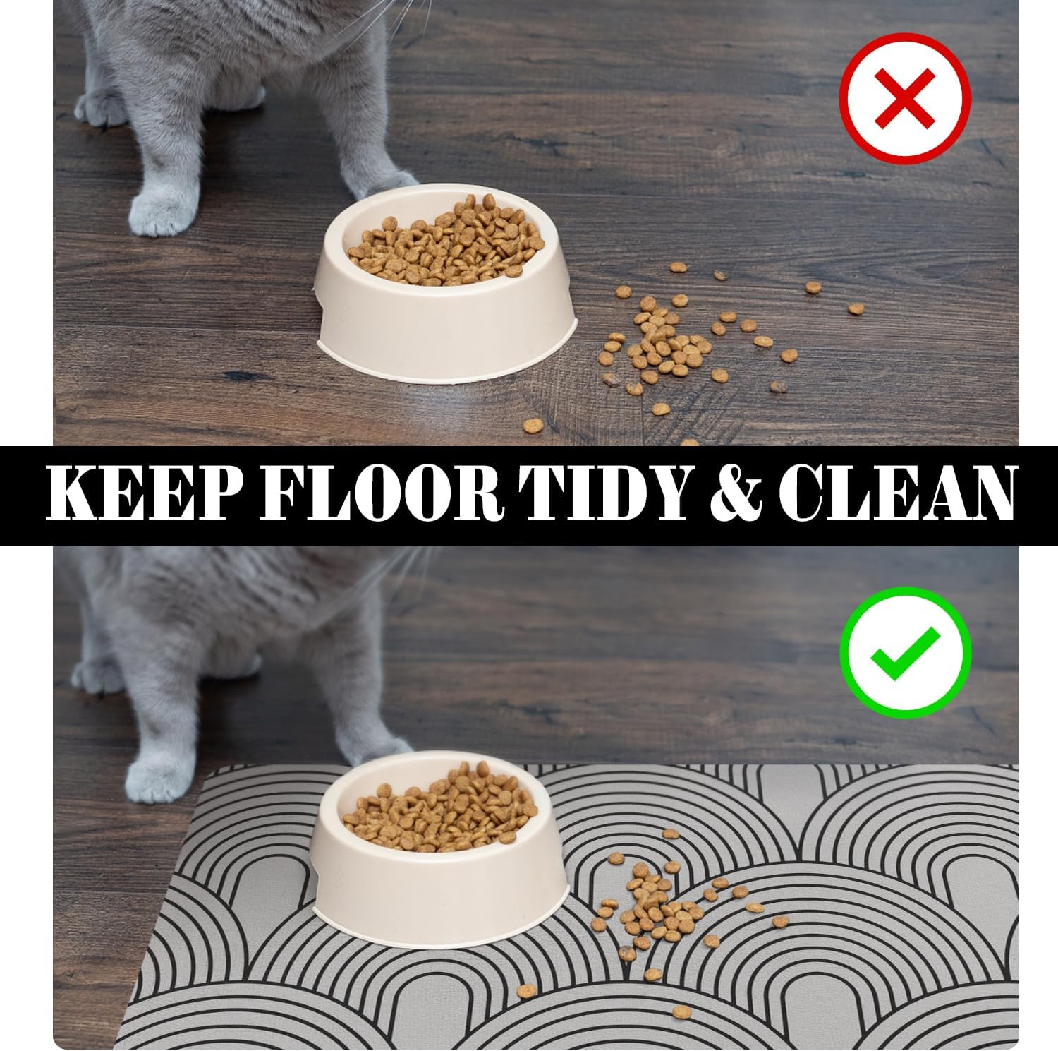 • Non-Slip Rubber Backing: Rubber backing makes sure the pet mats for food and water stay in place firmly. The durable water bowl mat is tear-resistant, which prevent your pets from ingesting it accidentally.