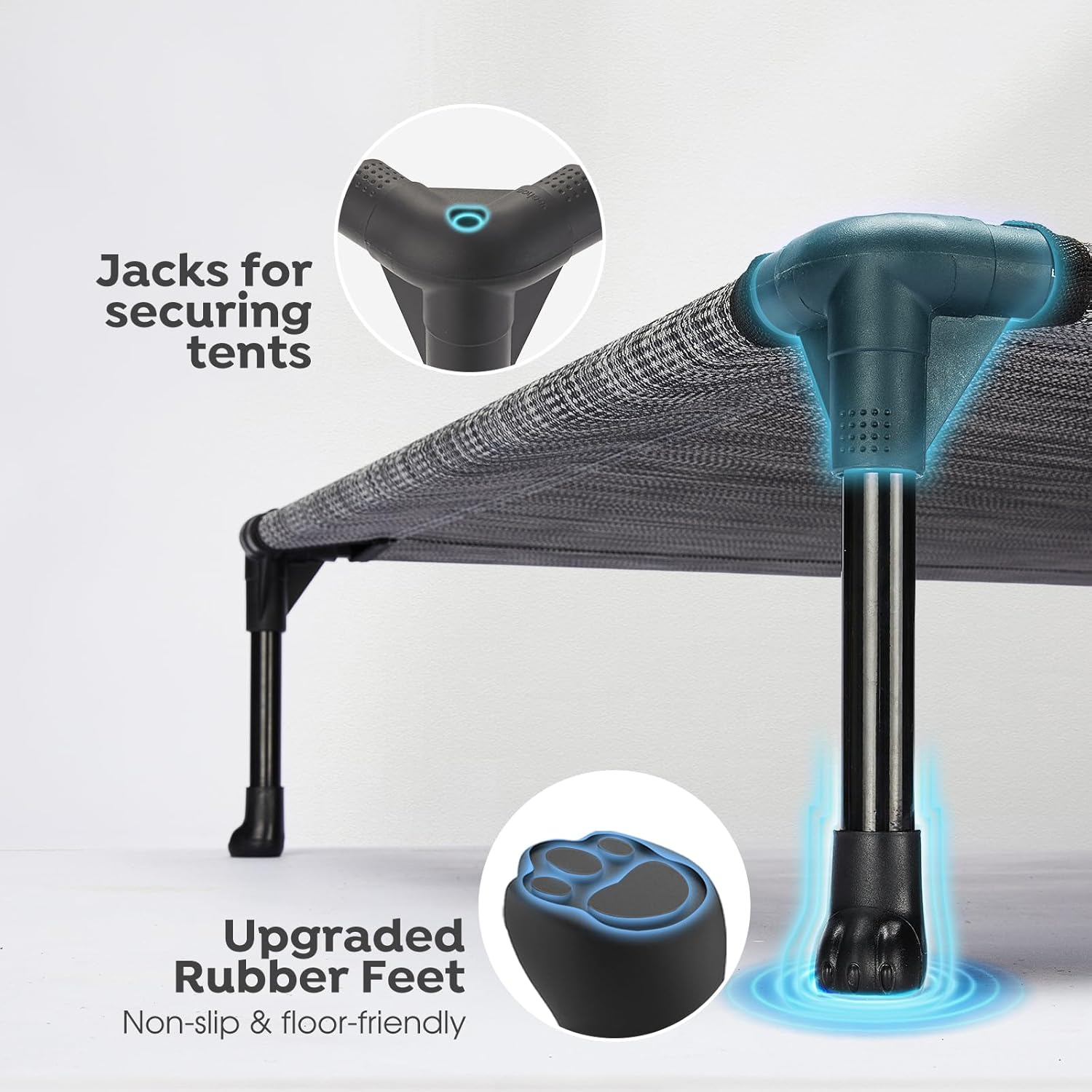 - Say Goodbye to Anxiety! Our dog cot is composed of powder-coated steel tube, durable textilene fabric, and non-skid rubber feet. Strong stability and high load-bearing capacity means saying goodbye to the fear of a sudden bed collapse.