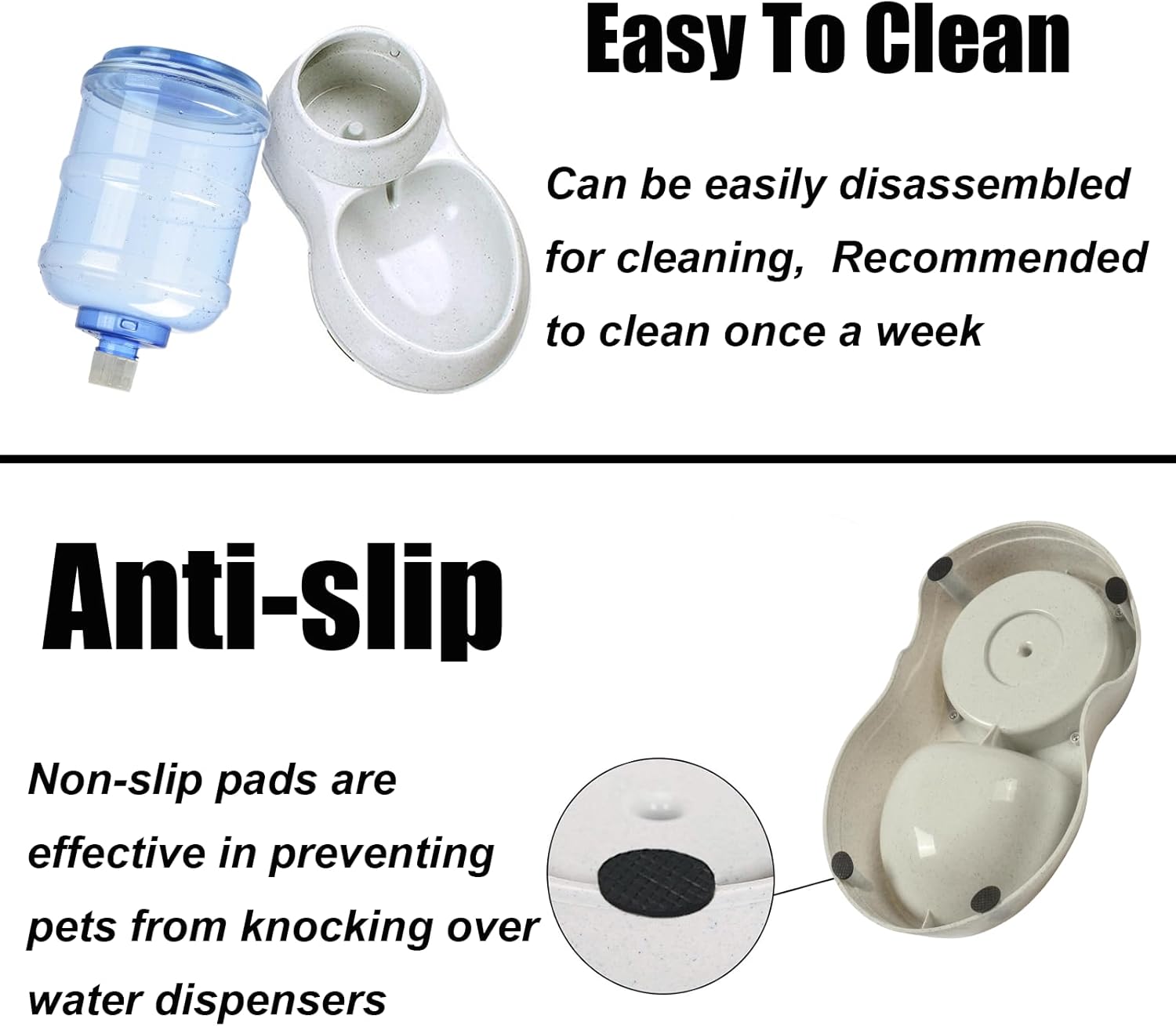 - Gravity Automatic Water Feeder Eliminates the Need for Frequent Refills: Say goodbye to the hassle of manually refilling water bowls multiple times a day. The gravity automatic water feeder system ensures a constant flow of fresh water, eliminating the need for frequent refills.This saves you time and effort, allowing you to focus on taking care of your pets,and all parts are removable, so it's easy to clean.