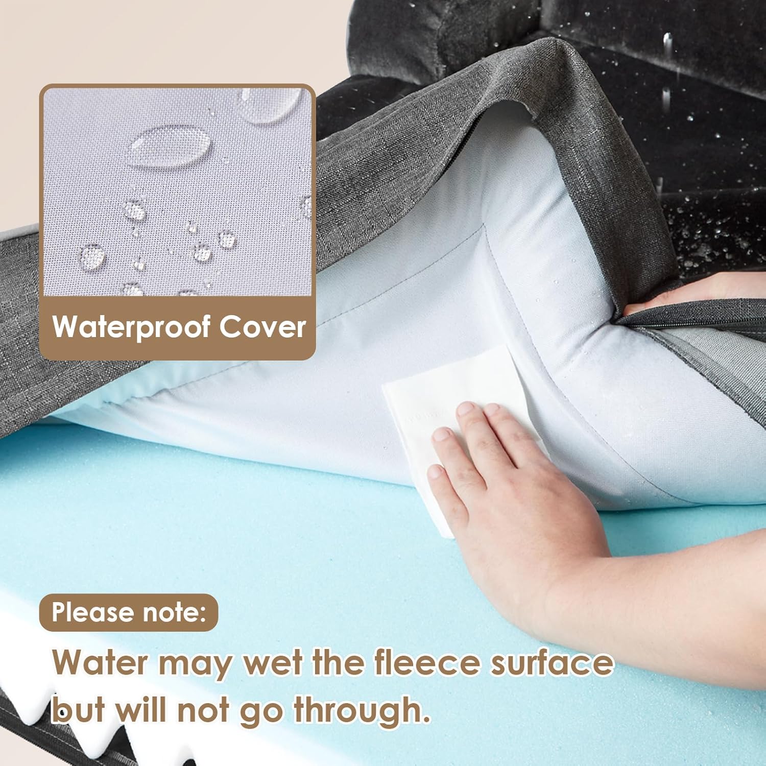 - WATERPROOF FILM and NON-SLIP BOTTOM: There is a waterproof film between the fleece surface and the bottom fabric that makes the dog bed waterproof. However, the faux linen on the side is not waterproof. A non-slip point on the bottom is not easy to slide, and keeps your dog bed steady.