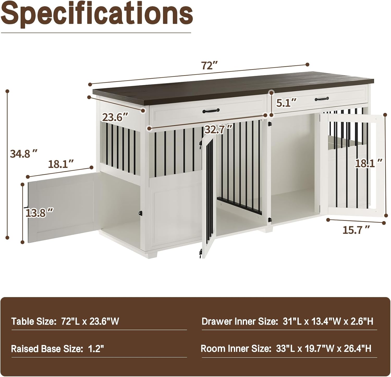 - MULTI-PURPOSE DOG CRATE FURNITURE - This furniture-inspired dog crate features a large 72"x 23.6" tabletop that can support up to 70 pounds. It's not just a dog crate, it can also serve as a TV stand, display shelf, plant stand, and more. The adaptability of this crate furniture offers a perfect fusion of practicality and style to your living space.