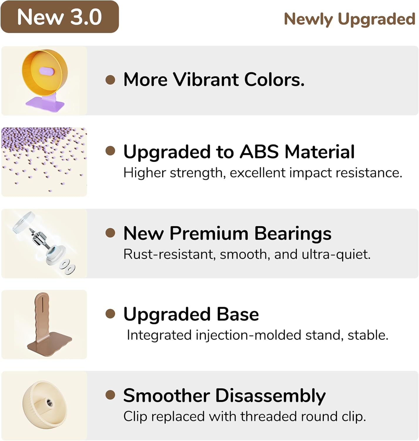 - New Premium Bearings: Our exercise wheel features high-precision bearings that ensure smooth, quiet, and durable performance. These advanced bearings help reduce noise and enhance the wheel's stability, providing a better exercise experience for your pet