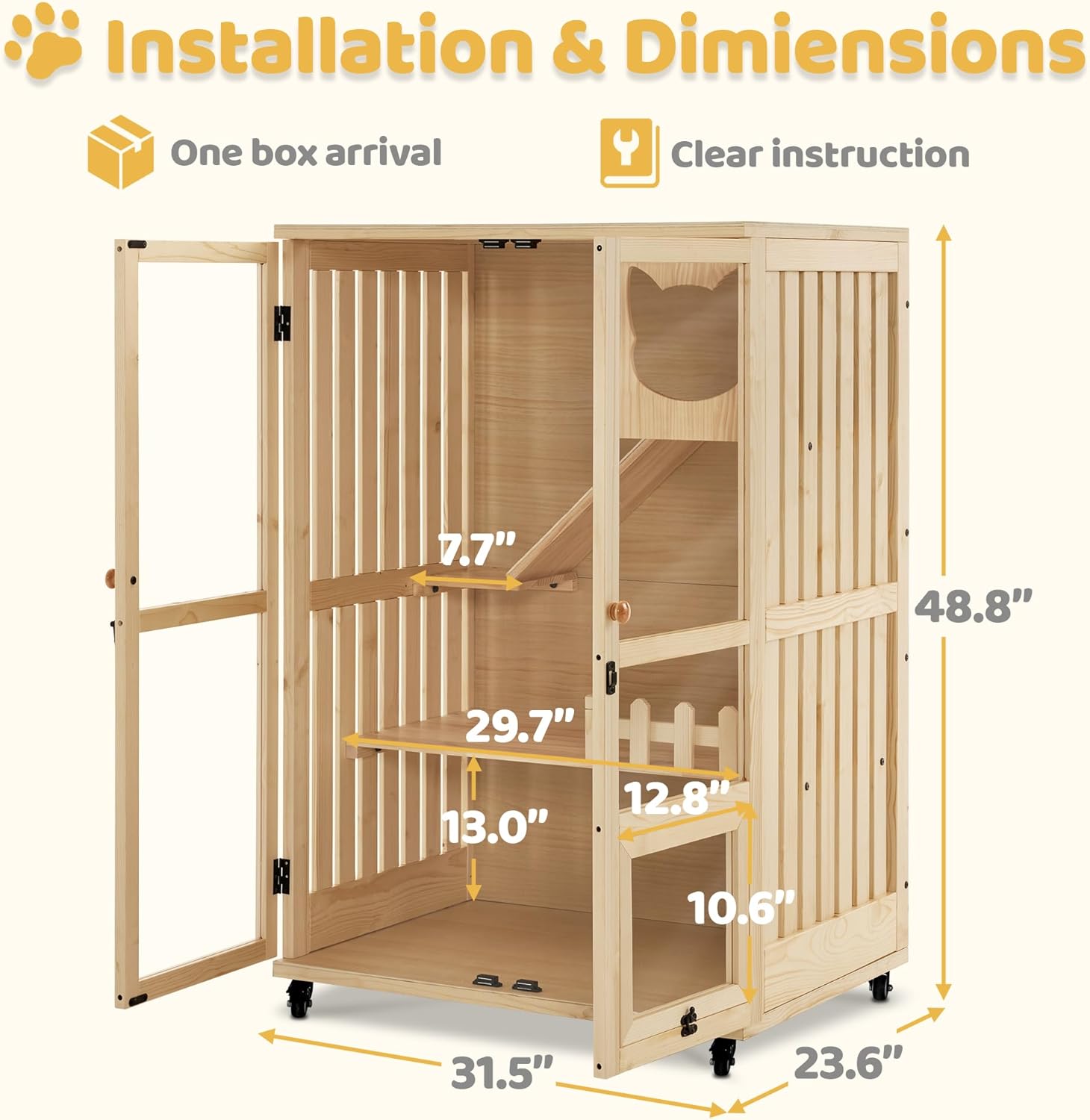 - Secure and Mobile Construction: Equipped with lockable universal wheels, this cat villa prevents mischievous escapes while facilitating easy cleaning; The wheels allow for convenient movement and repositioning, ensuring stability wherever you place it