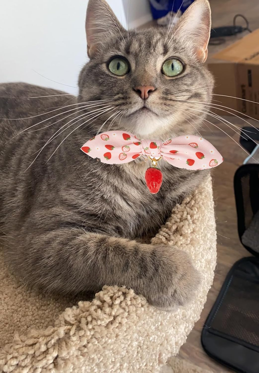 2 Pack Breakaway Cat Collars with Cute Bunny Ear Bowtie and Bell, Bow Tie Kitty Collars for Female Girl Cats(Yellow Bee & Pink Strawberry)