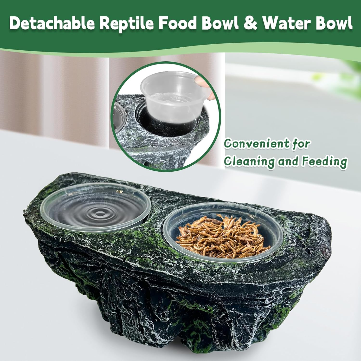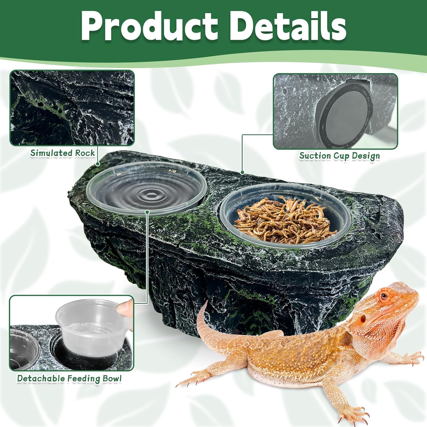 - Natural Looking: The amphibian feeder ledge takes on the look of a simulated rock with realistic rock textures and verdant accents, creating an ideal habitat for your pet in nature. This reptile food dish can not only be used as a reptile feeding table, but also as a beautiful decoration in the terrarium