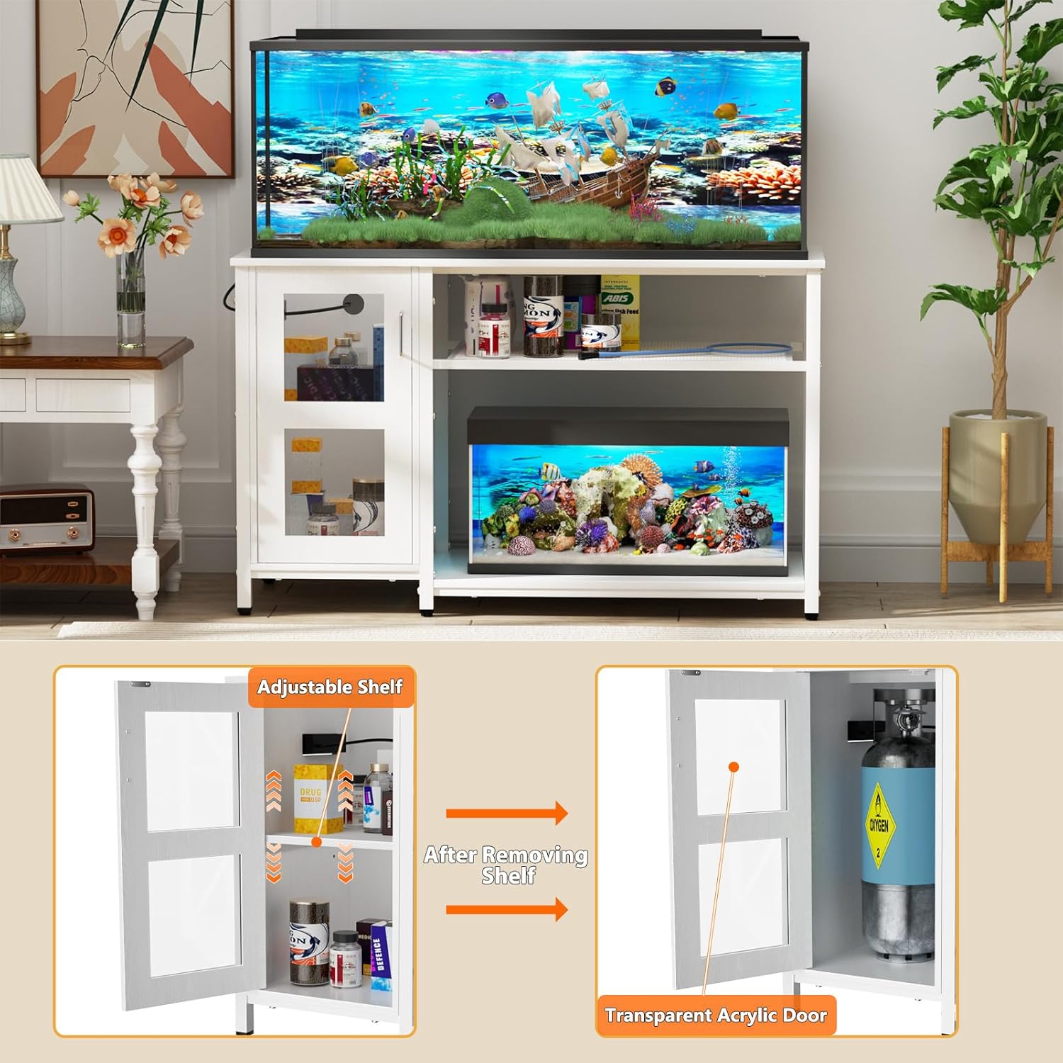 - Convenient Storage: This large fish tank stand easily keeps everything organized. First-level compartment on the right side stores fish food, nets, cleaning tools, and other accessories. The storage cabinet with doors has an adjustable design, removing the compartment allows for accommodating canister filters and CO2 hoses