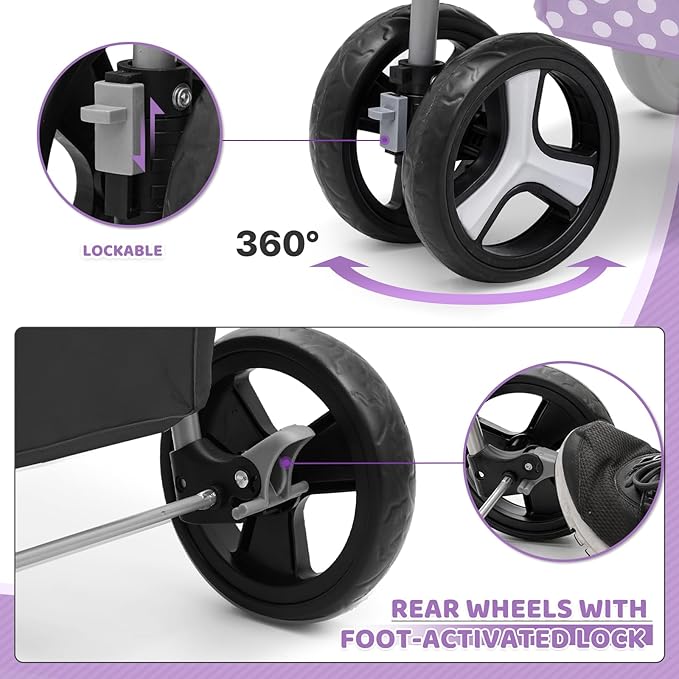 - Advanced Wheel Suspension, Braking & Safety System: Designed for stability, maneuverability, and control, our pet stroller features 360° swivel front wheels for effortless navigation, while the shock-absorbing rear wheels ensure a smooth, stable ride on various terrains. For added safety, the dual rear-wheel braking system provides a secure stop on slopes and uneven surfaces, giving pet owners peace of mind during strolls