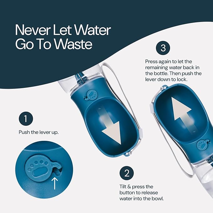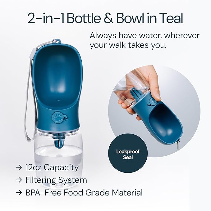 - Hydrate Anywhere: The dog travel water bottle is perfect for keeping your pup hydrated on the go. With a leakproof and filtered design, plus an easy locking system, this 2-in-1 dog water bottle and bowl combo makes sure your dog gets their water wherever the adventure takes you