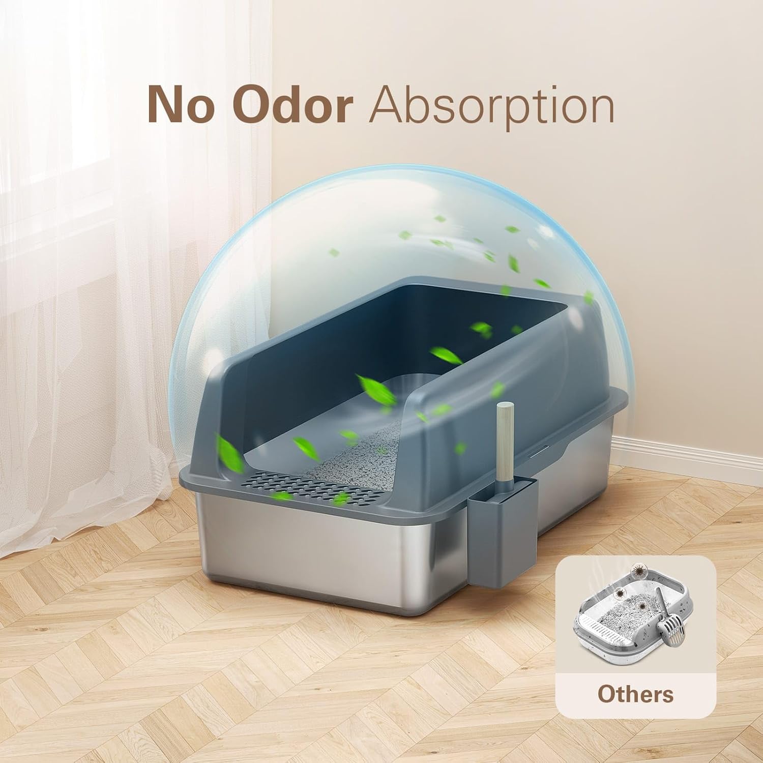 - 【Sturdy Stainless Steel Build】: Constructed from thick stainless steel for added durability, the stainless steel litter box is designed to withstand daily use, resisting rust and scratches from cat paws. The non-porous nature feature of stainless steel litter box also prevents odors from lingering, extending the lifespan and reducing the need for frequent replacement.