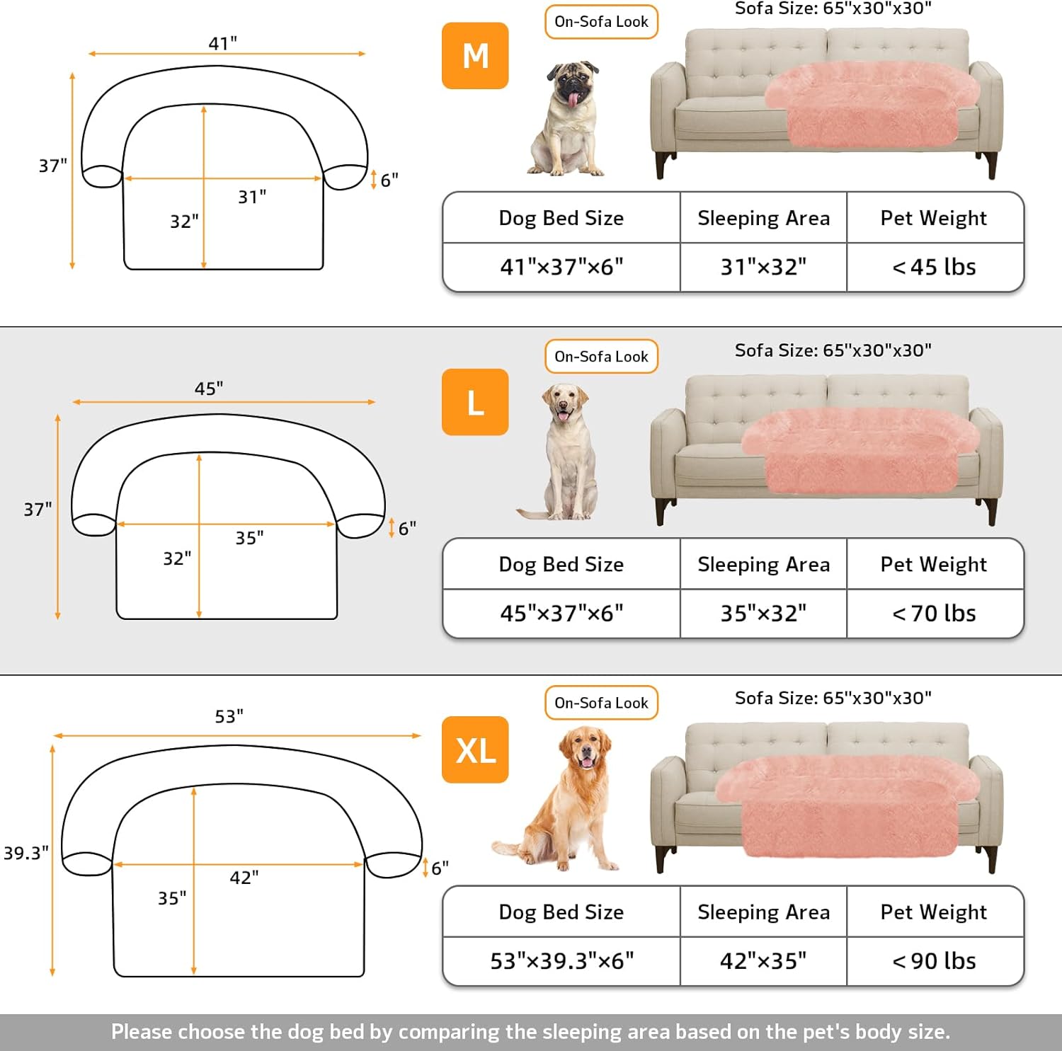 - 【Multiple Size Selection】The couch pet bed has 5 sizes for you to choose from. XS: 31"x23.5" dog bed for small pets. S: 35“x31" dog bed for cats and small dogs. M: 41”x37" dog bed for medium dogs. L: 45“x37" dog bed for large dogs. XL:53"x39" dog bed for large dogs. We have enlarged the sleeping area for pets to give dogs more space.