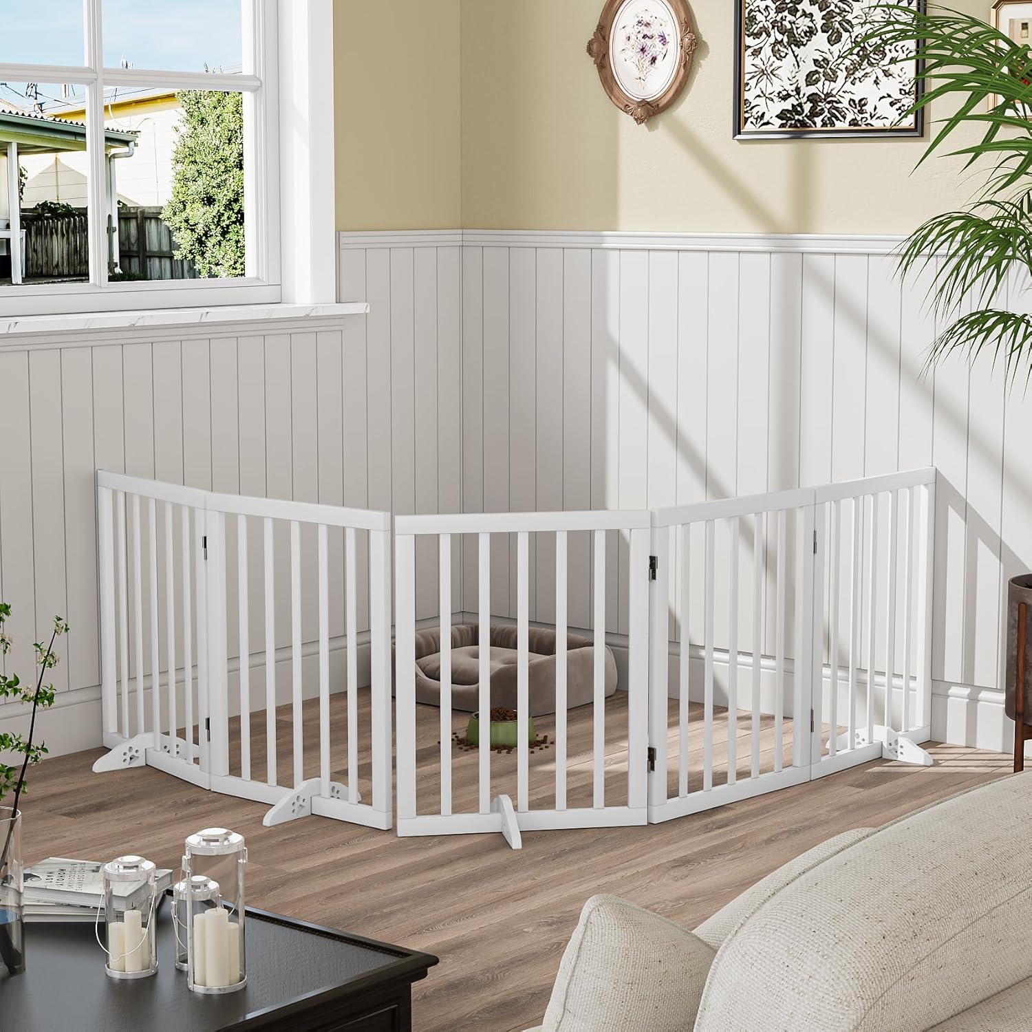 - Foldable Pet Gate: This pet gate is stand alone, no-drill, and features a 360-degree hinge design that allows you to fold it into a wide z shape or temporarily enclose it into a square fence. The wide slats of doggie gate for indoors provide a secure barrier without making your pet feel like they are completely isolated from your home