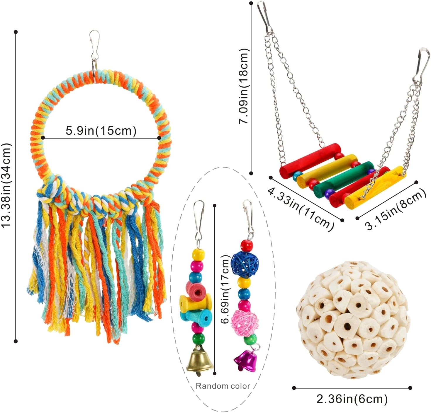 - 【INSTALL】 Each bird toys has a hanging hook, which can easily help you hang in the bird cage or play area, saving you time and making it easier to install