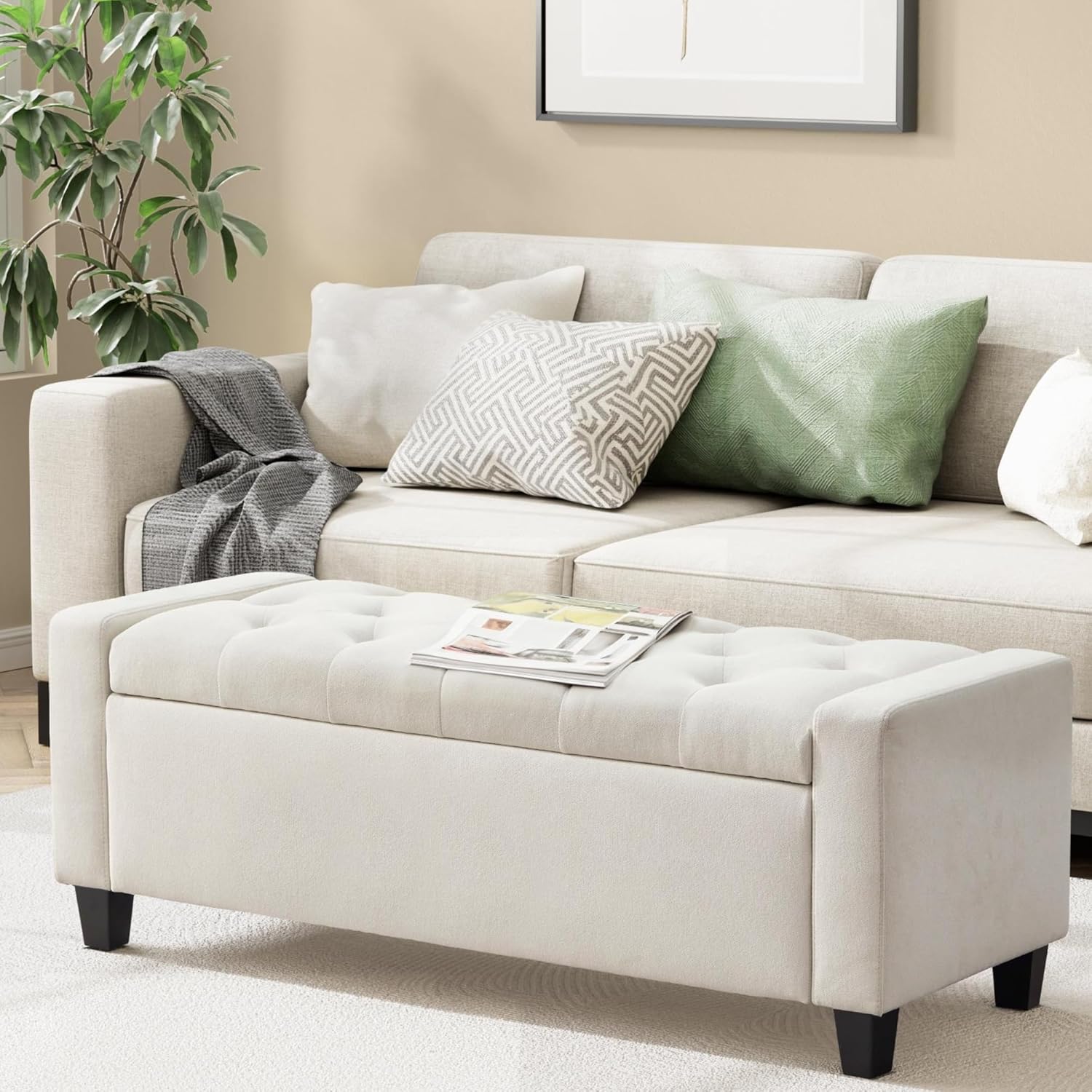 Ottoman with Storage, 48.8" Fabric Storage Ottoman Bench with Hinge, Bedroom Bench, Upholstered Benches with Seating for Living Room, Entryway (Beige)